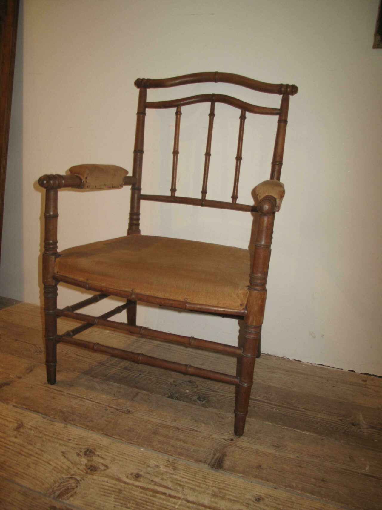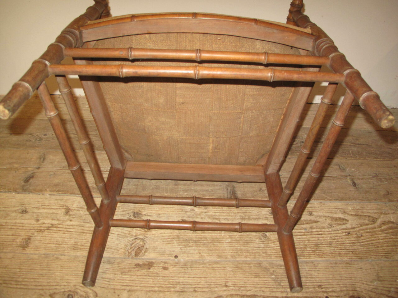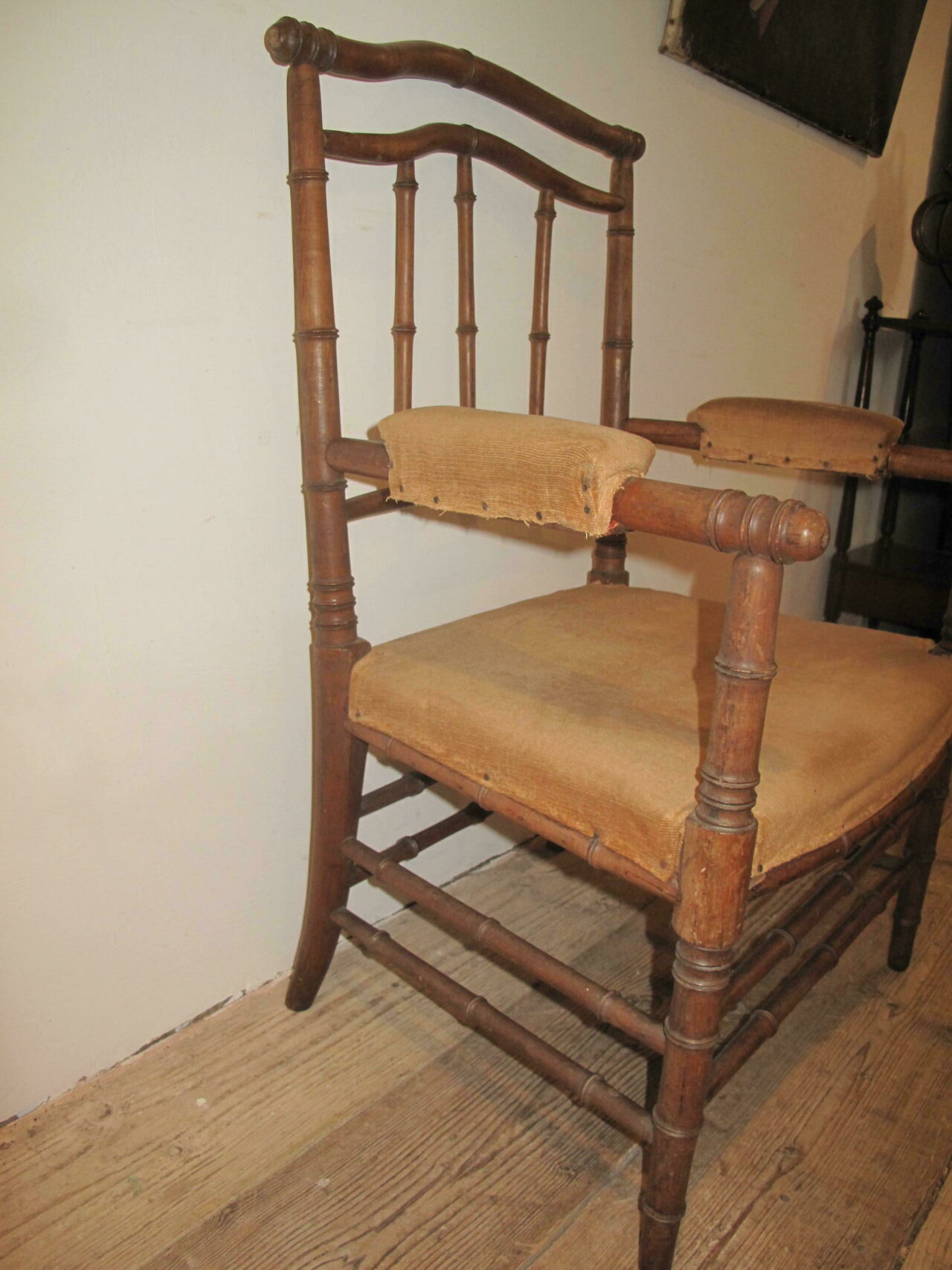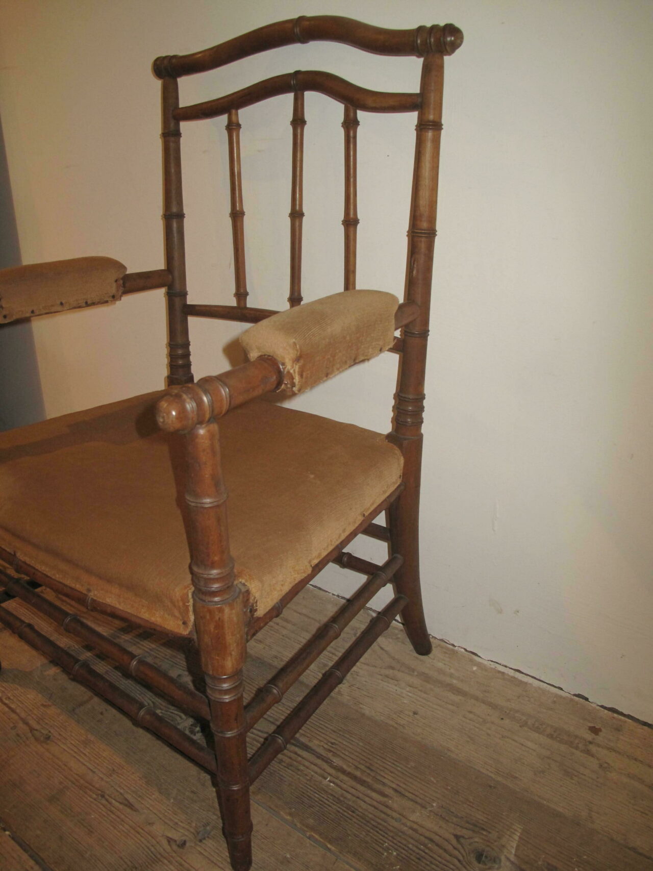 Antique faux bamboo chair with excellent woodwork and webbing. Ready for you to put your chosen fabric on. Late 19th century.