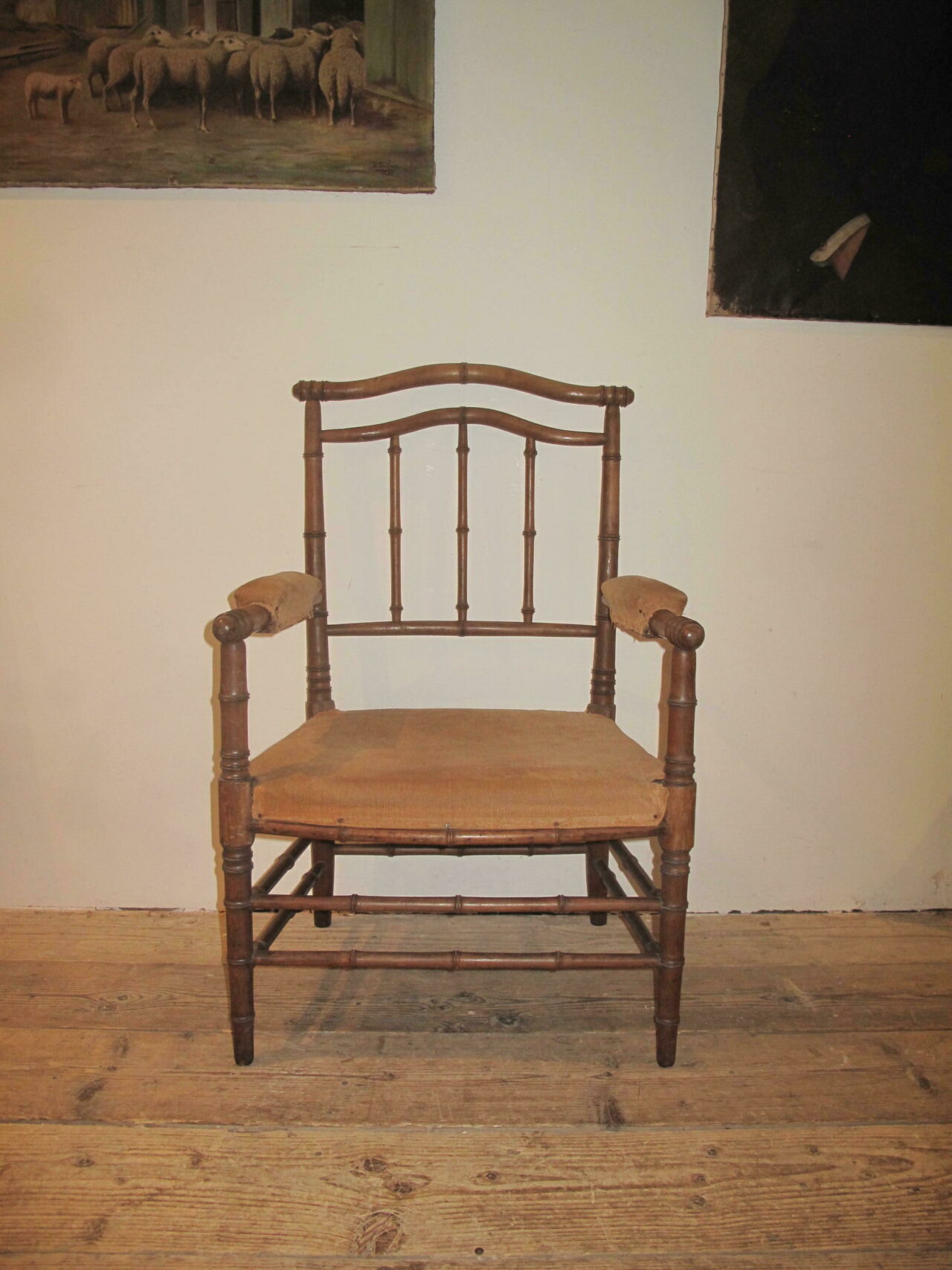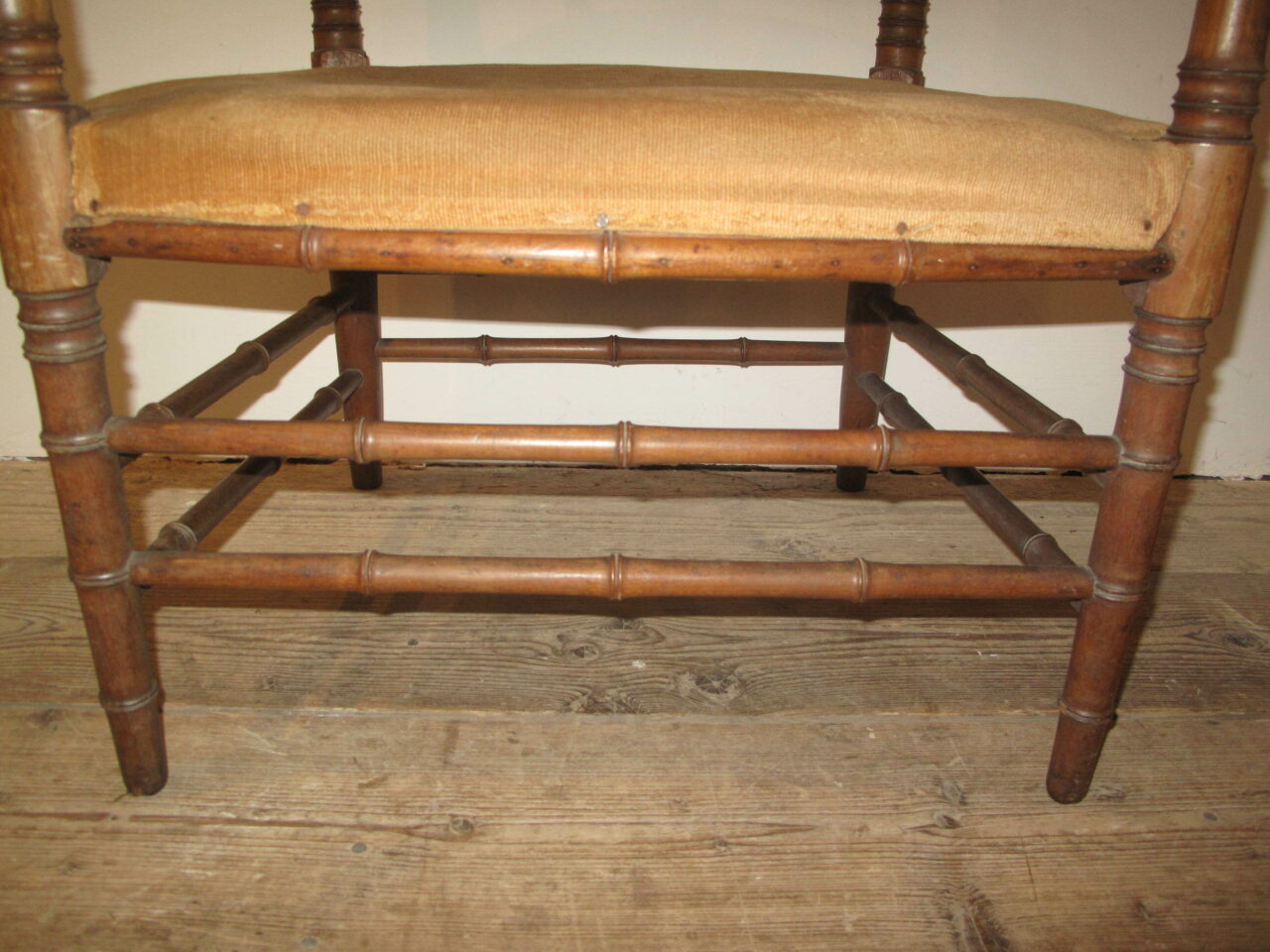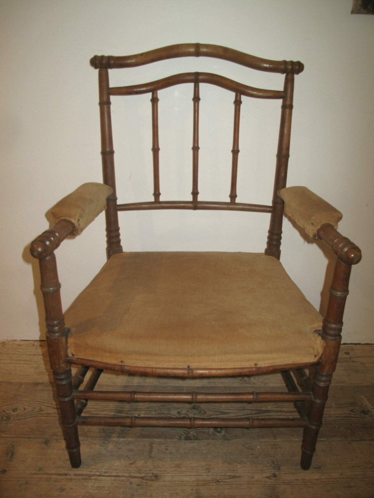 Antique faux bamboo chair with excellent woodwork and webbing. Ready for you to put your chosen fabric on. Late 19th century.