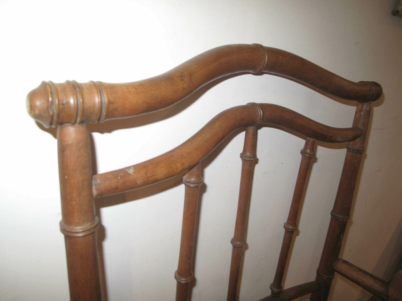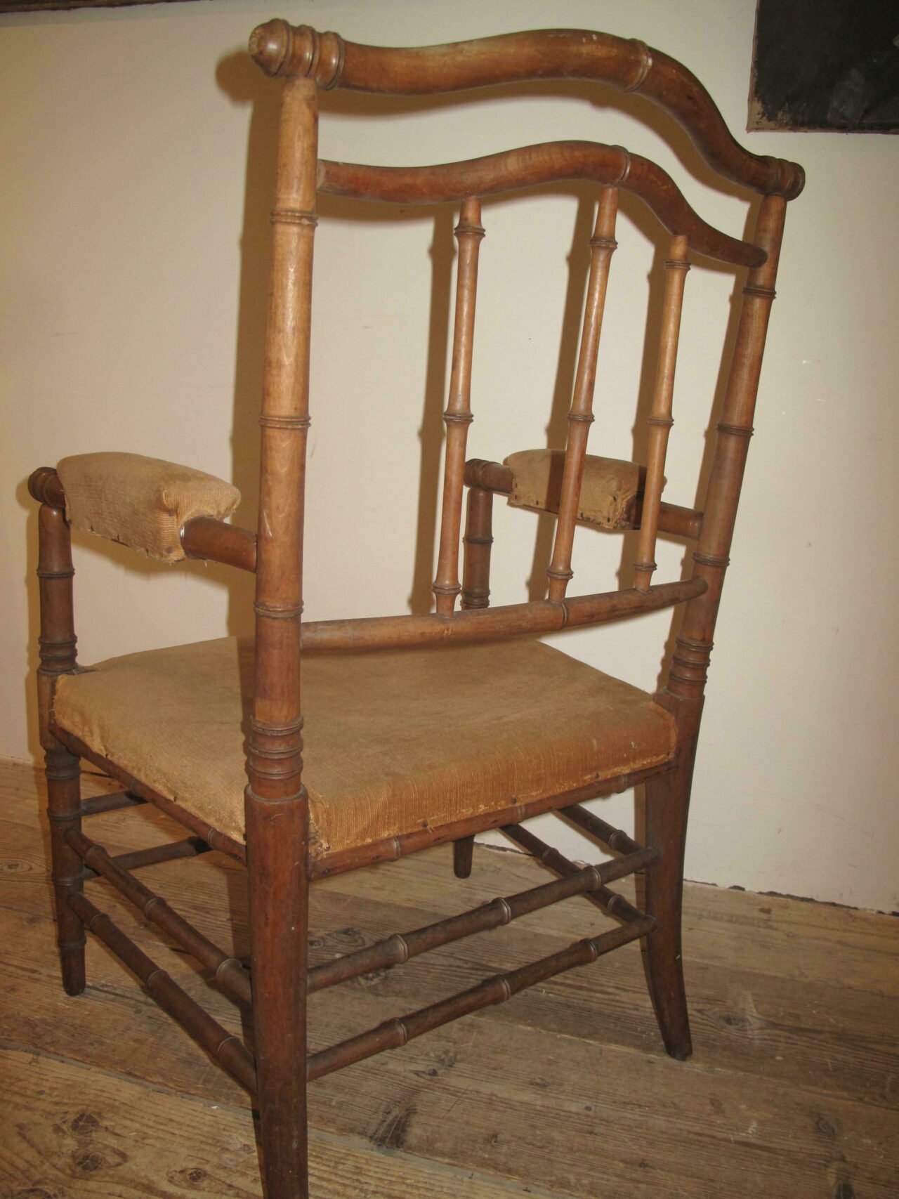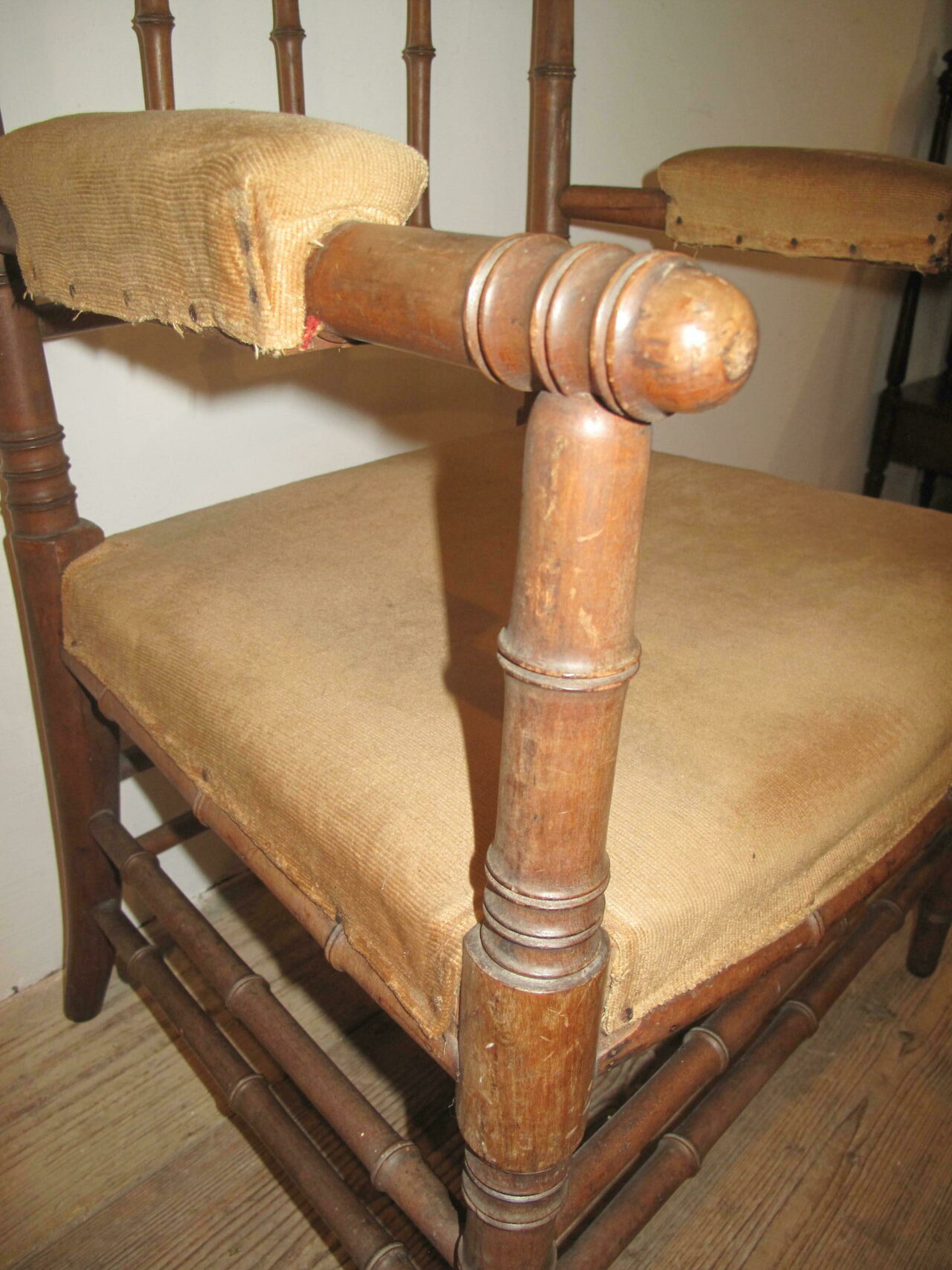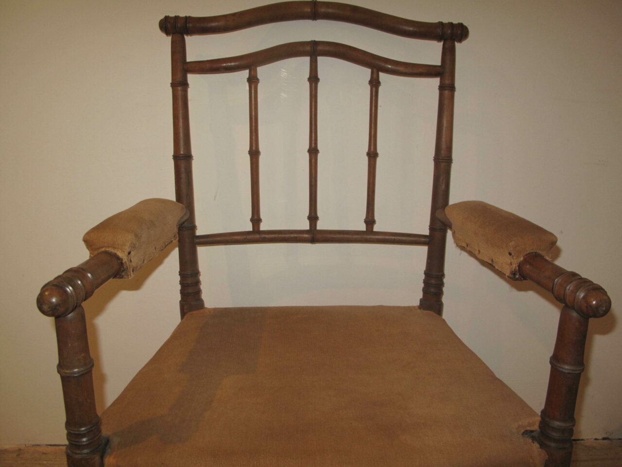 Antique faux bamboo chair with excellent woodwork and webbing. Ready for you to put your chosen fabric on. Late 19th century.