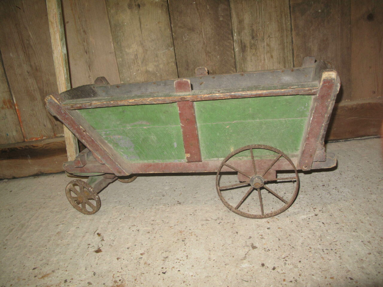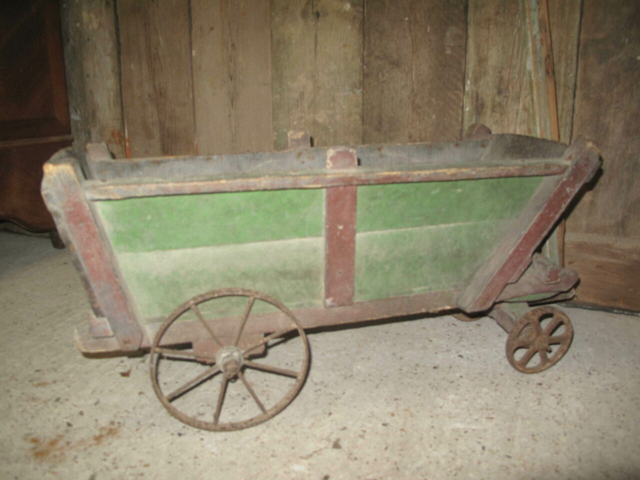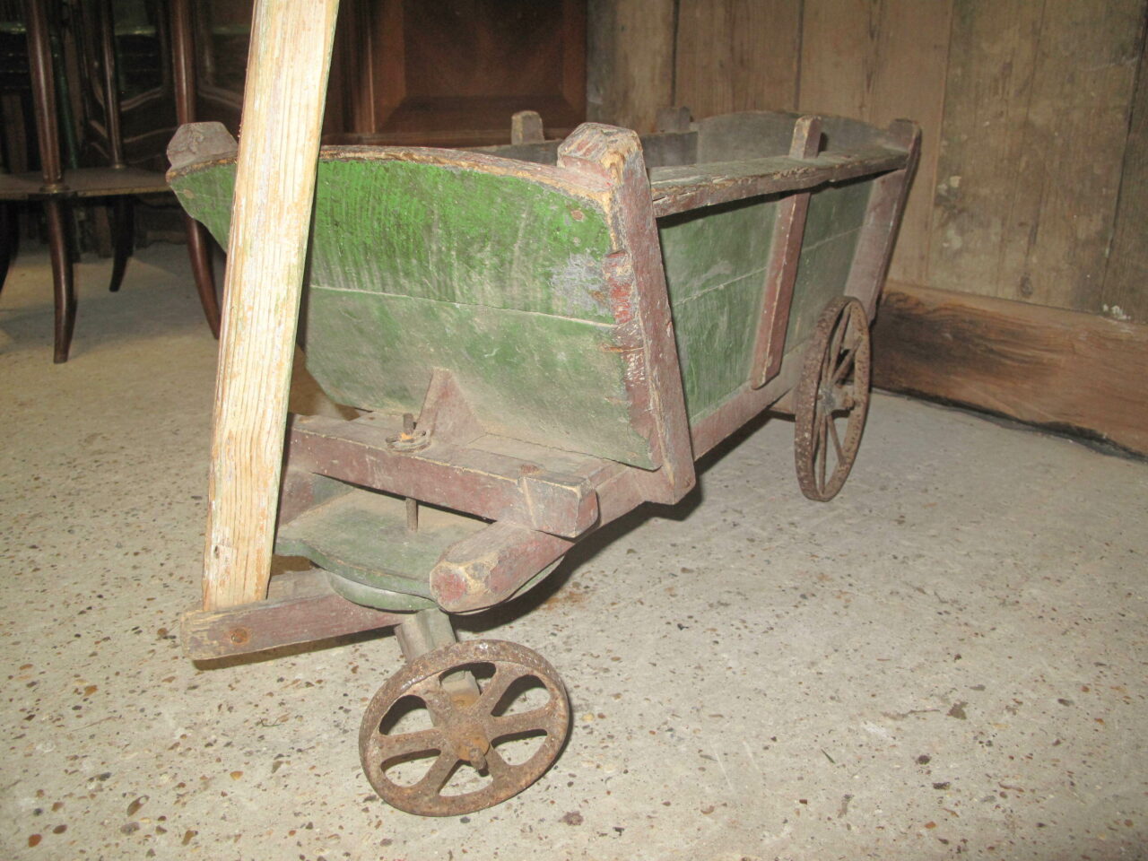 Antique provincial cart in its original green and red paint. The carts wheels all run freely. c.1880. The cart came from a cellar of a house in a Paris suburb.