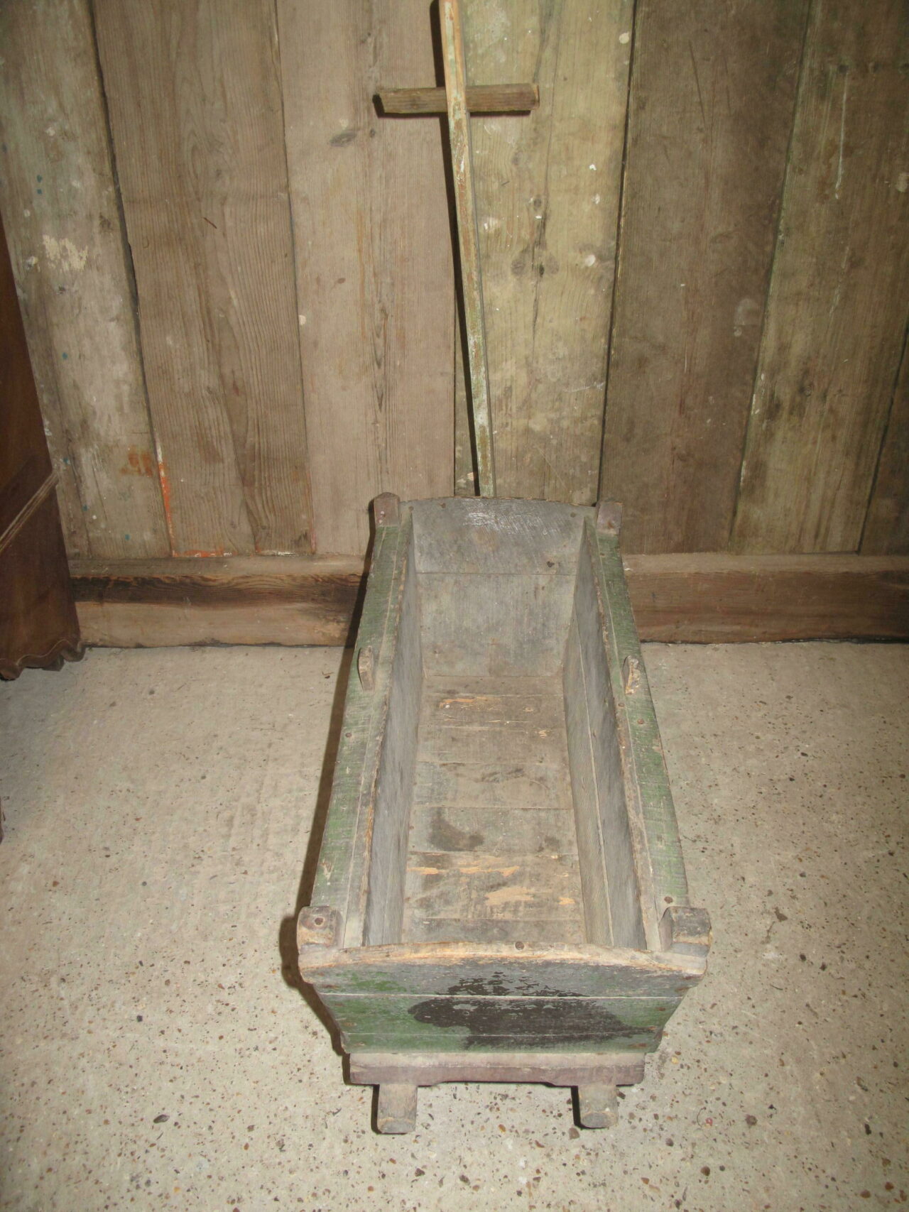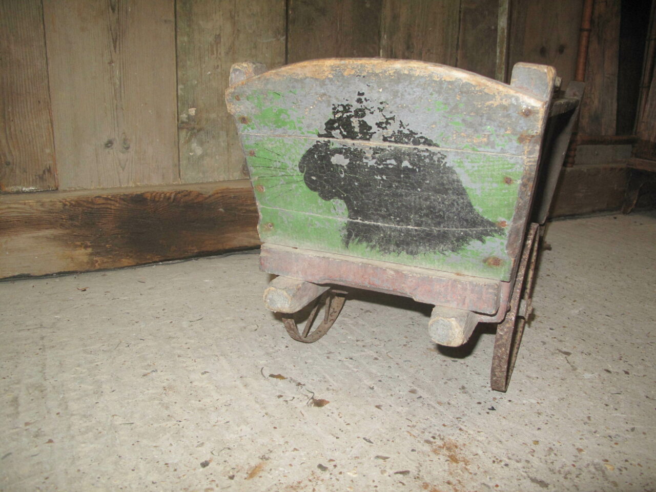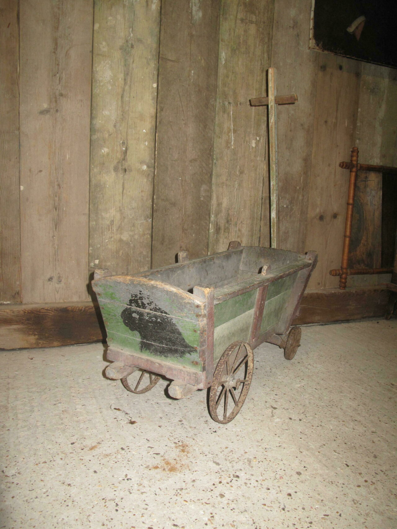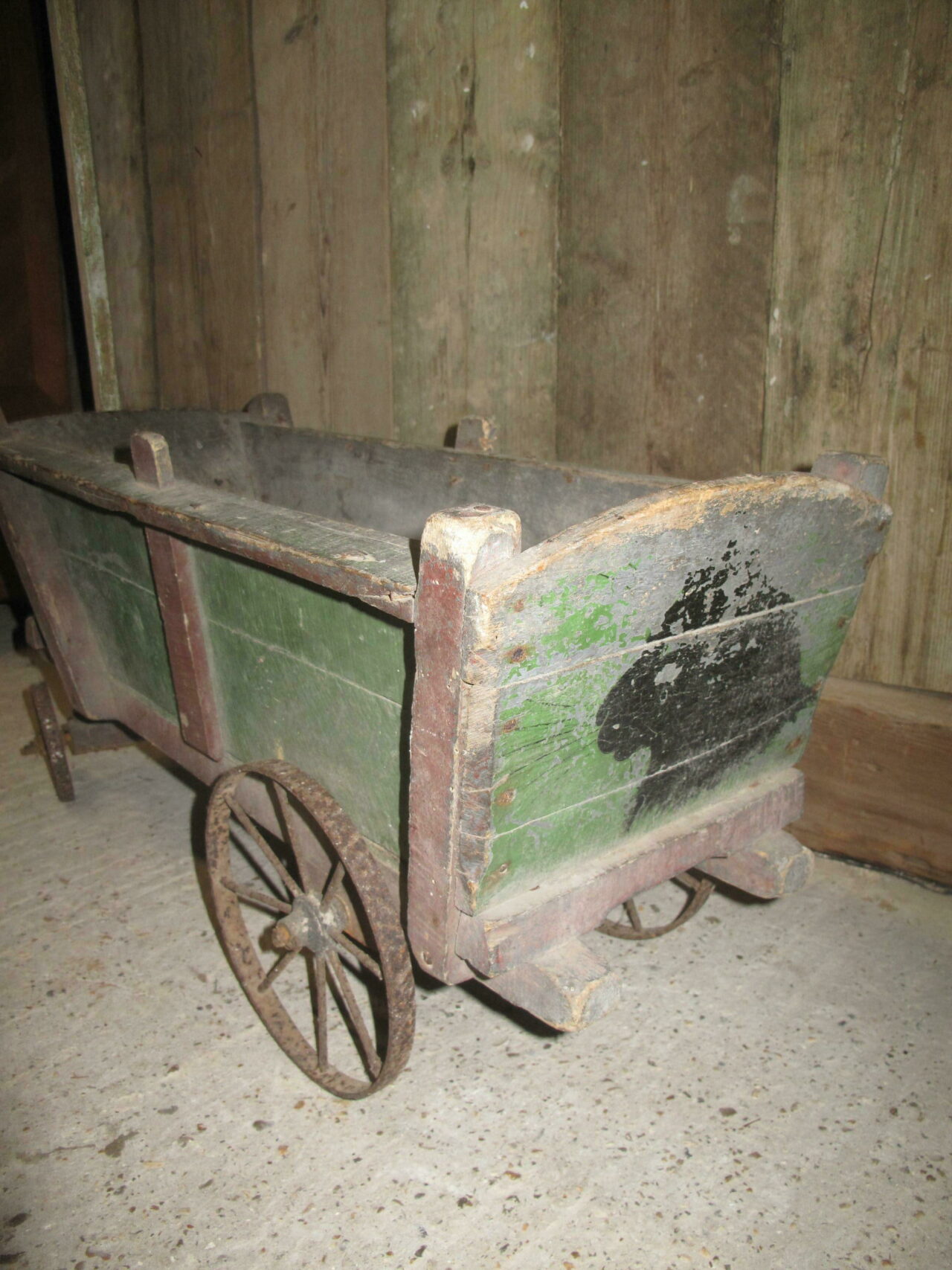 Antique provincial cart in its original green and red paint. The carts wheels all run freely. c.1880. The cart came from a cellar of a house in a Paris suburb.