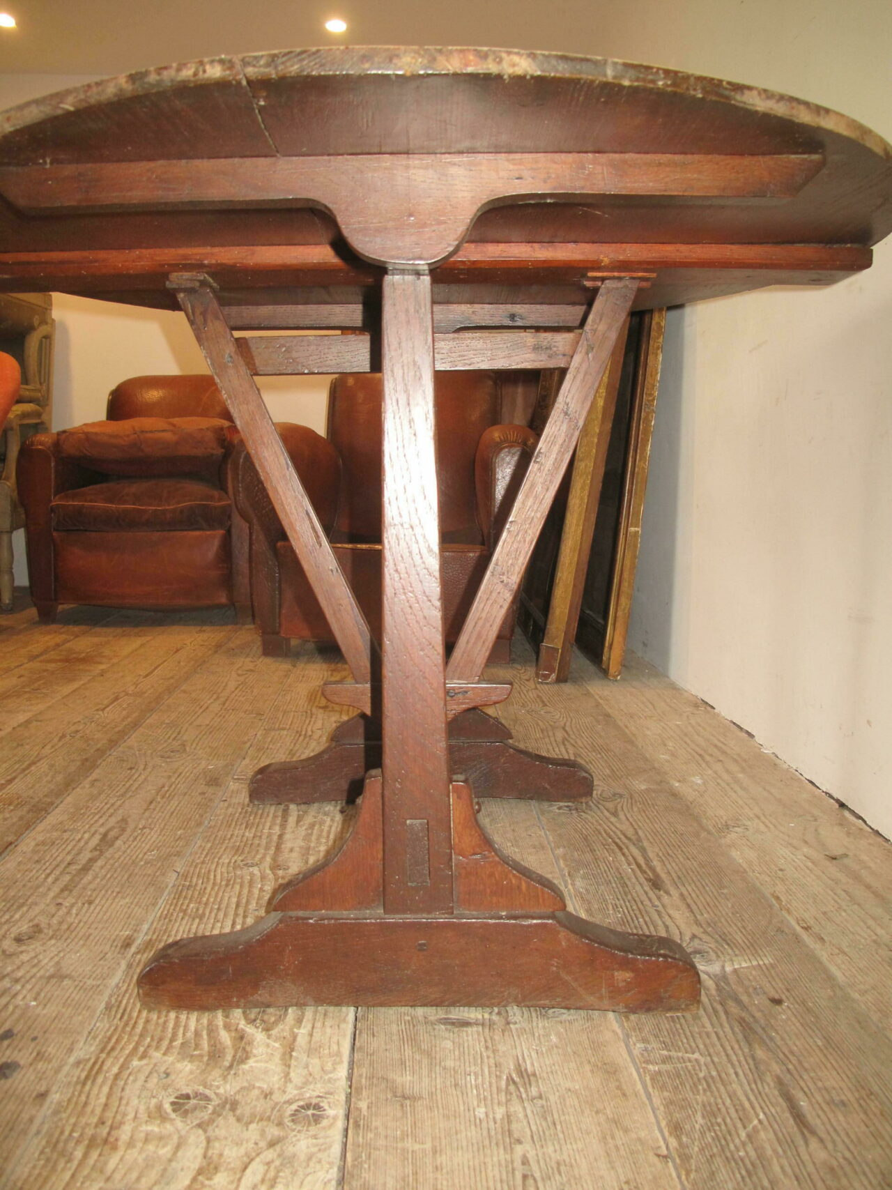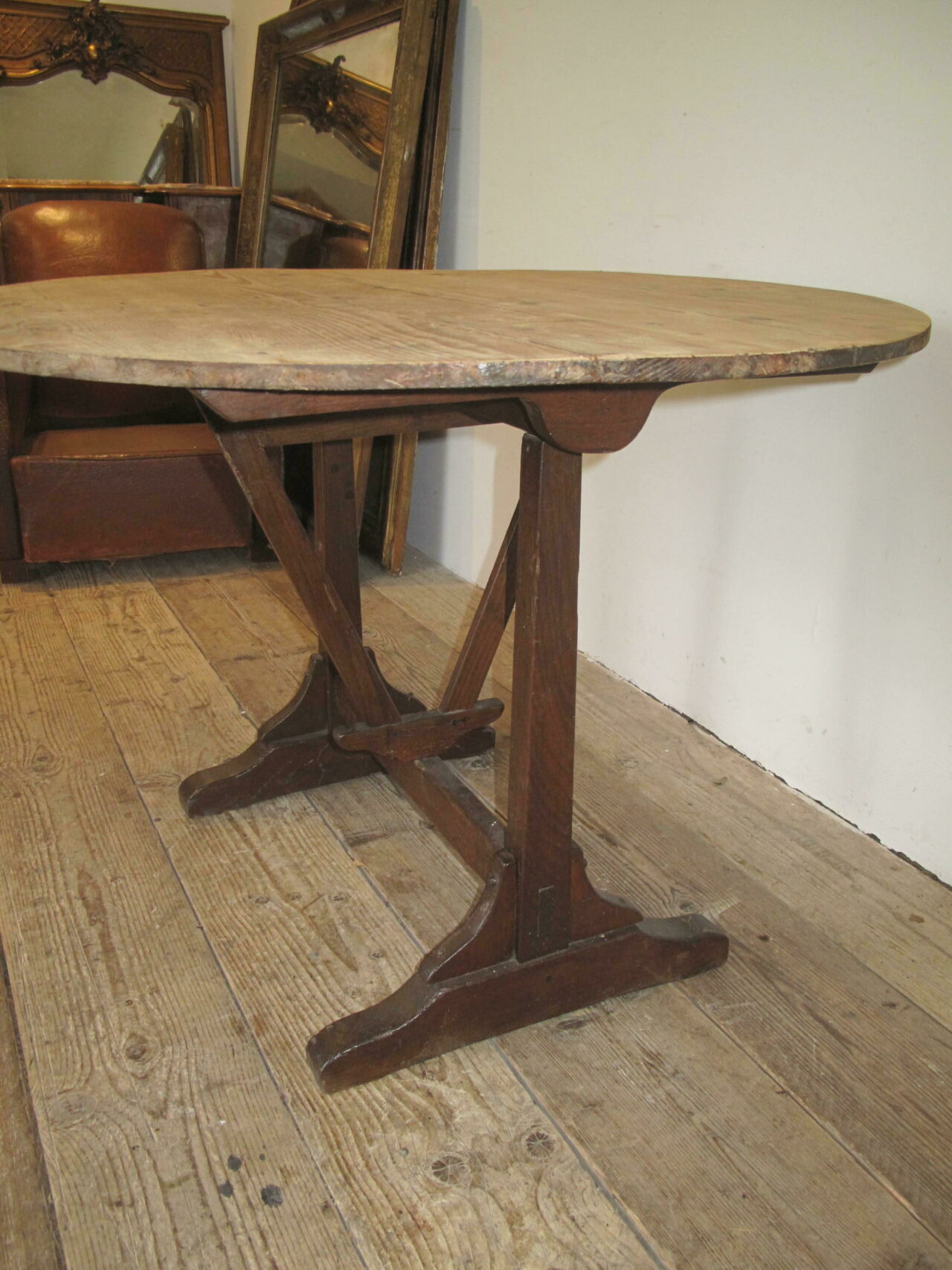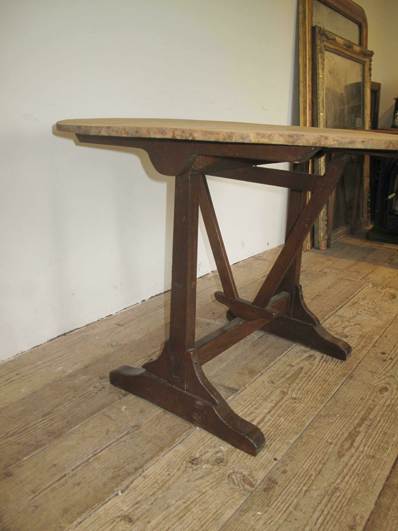 Antique vendage table in good condition straight from a vineyard in southern France. The table has a pine top and a sturdy oak base. The table folds easily and is in good condition. c.1890.
