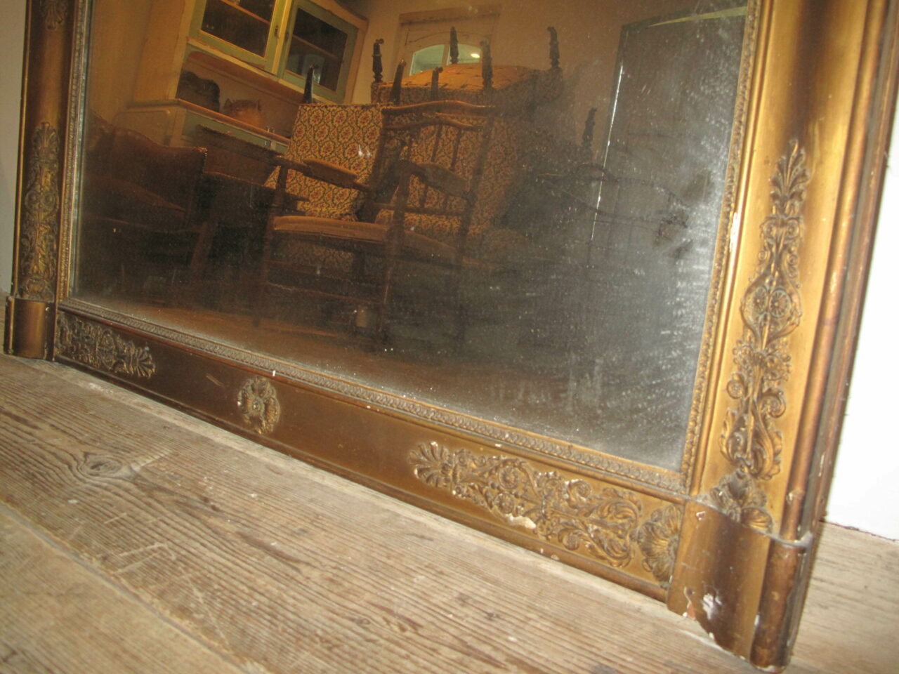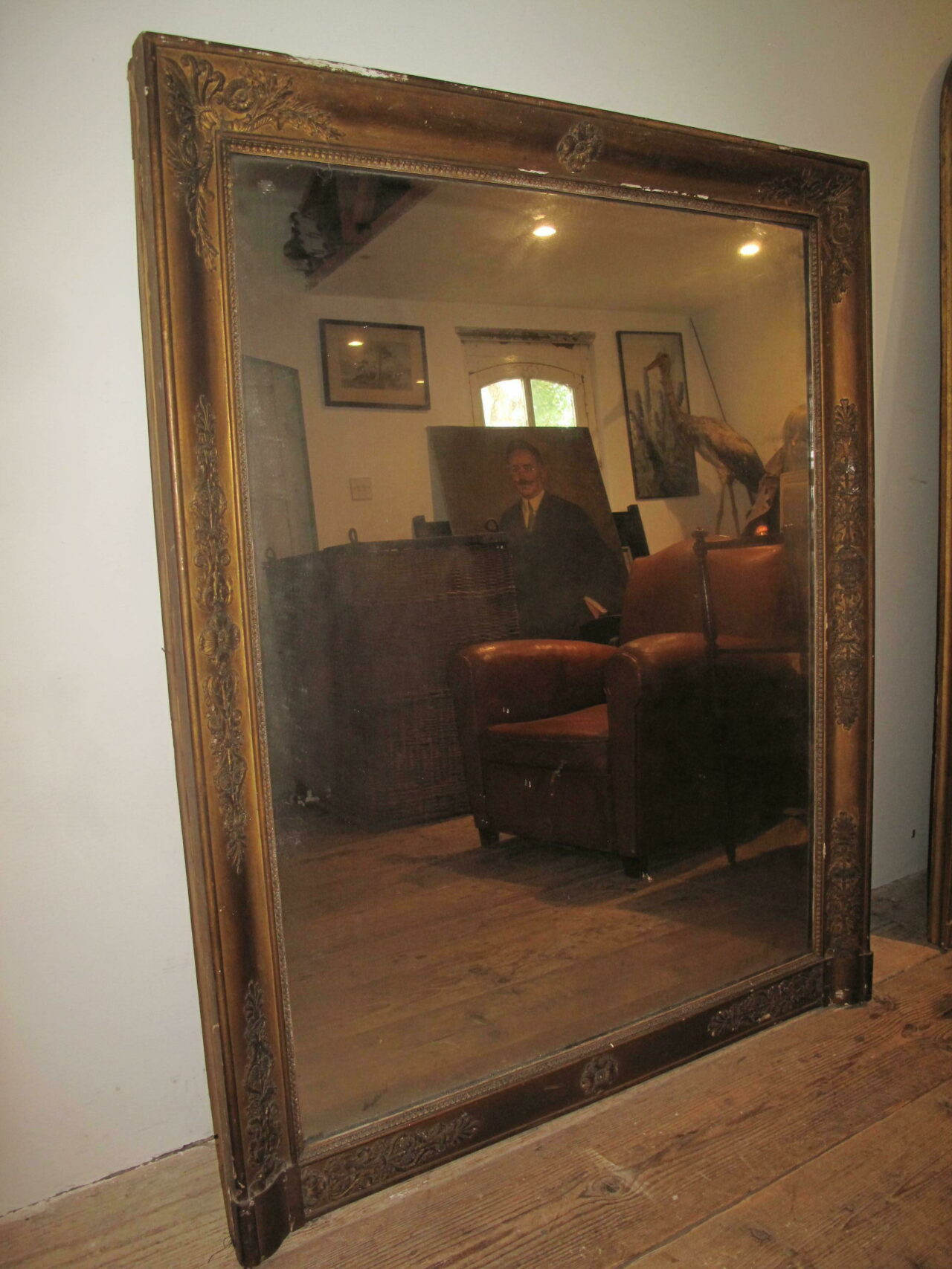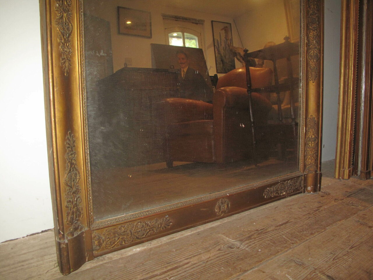 Large antique mirror with its original faded gilding, glass, and back panels. c.1860.