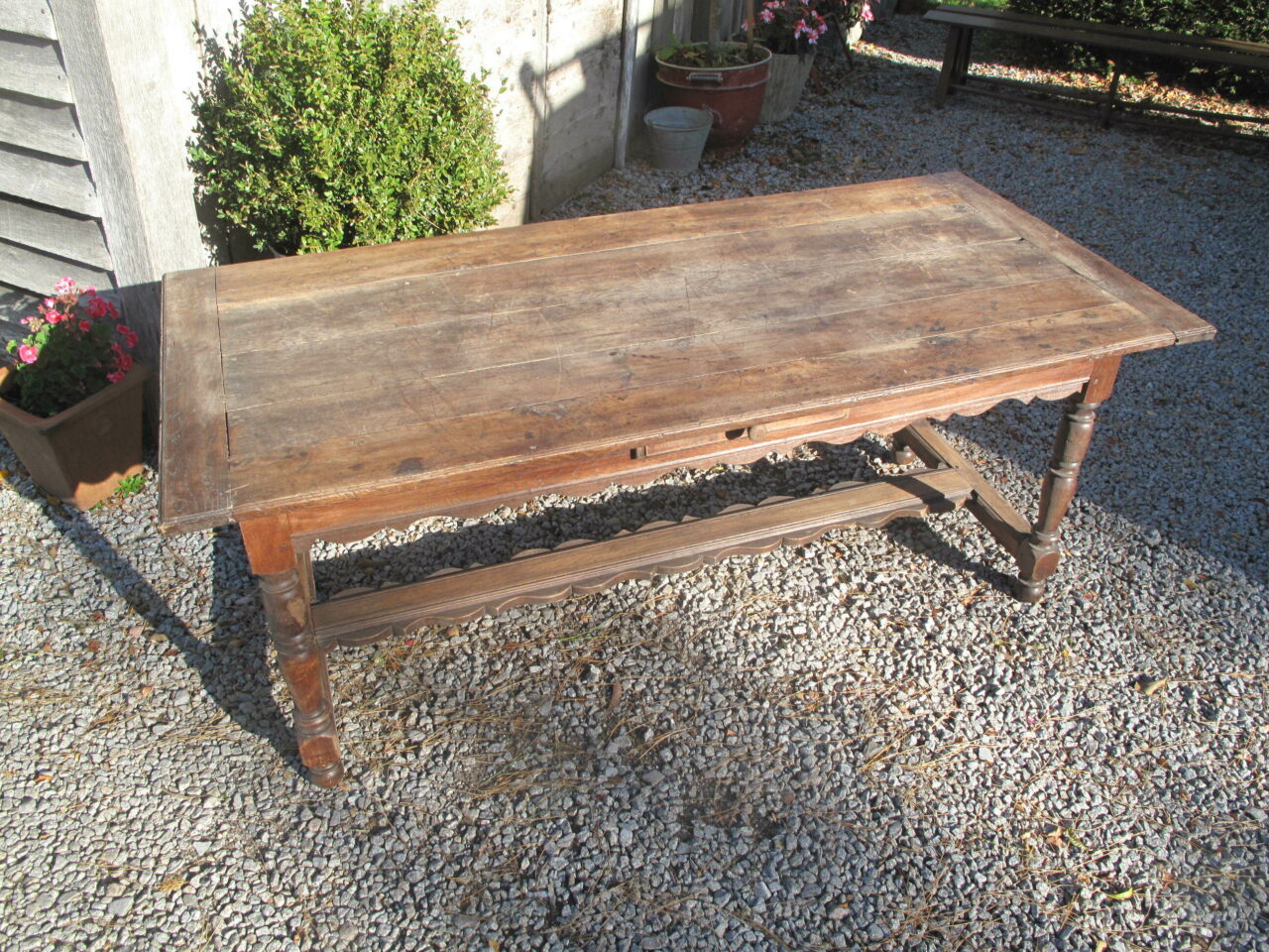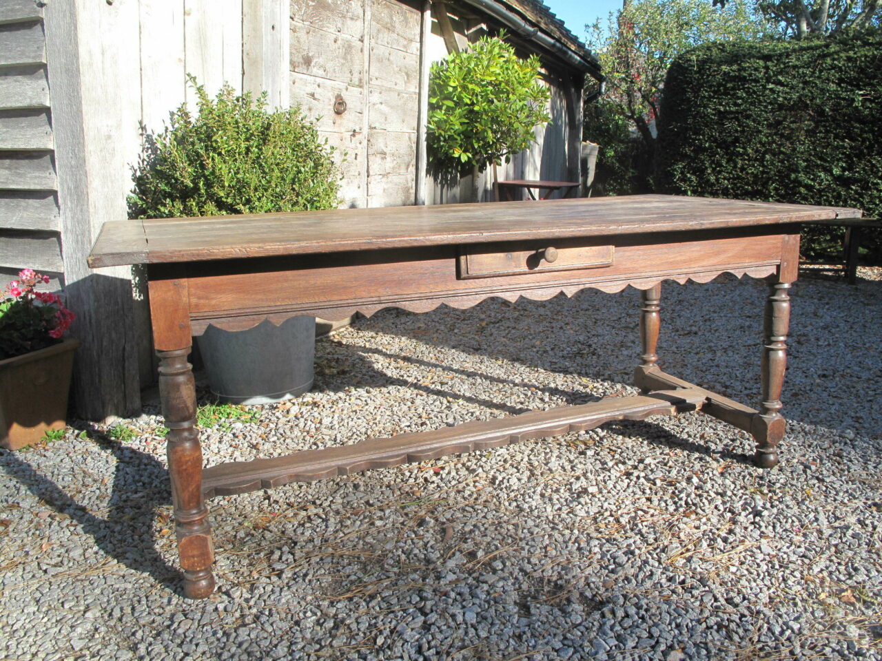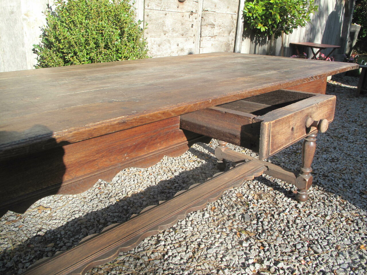 Large antique oak dining table from north eastern France. The table has a central sliding drawer that moves easily. The table dates from the first part of the 19th century so it has the odd knock and bruise but it is in good sturdy condition.