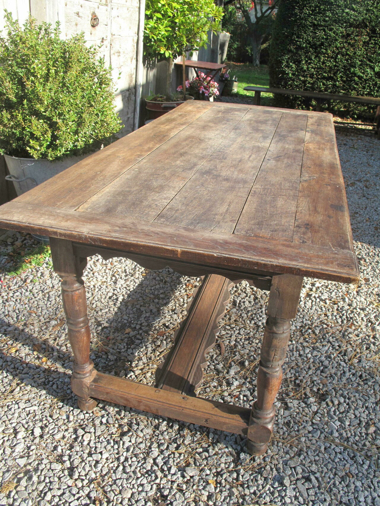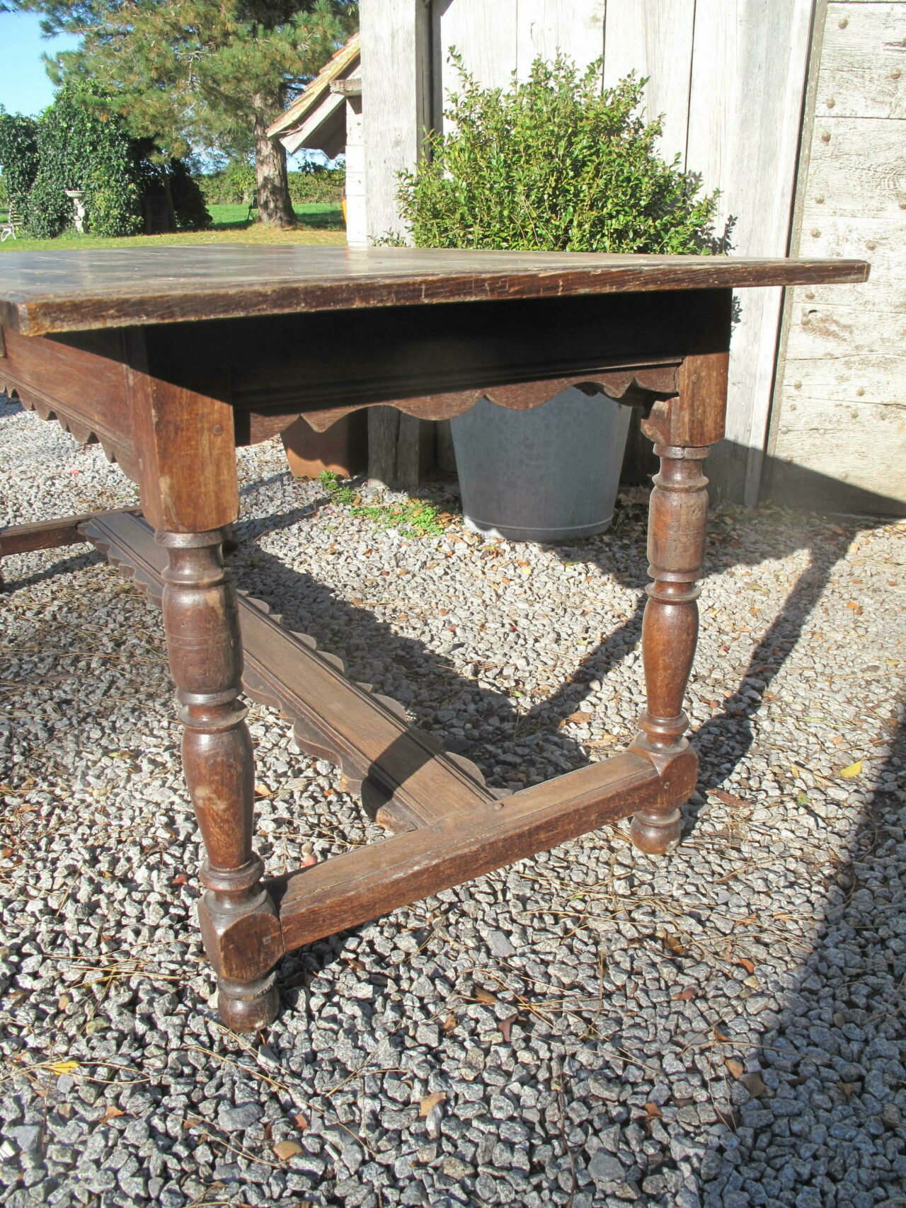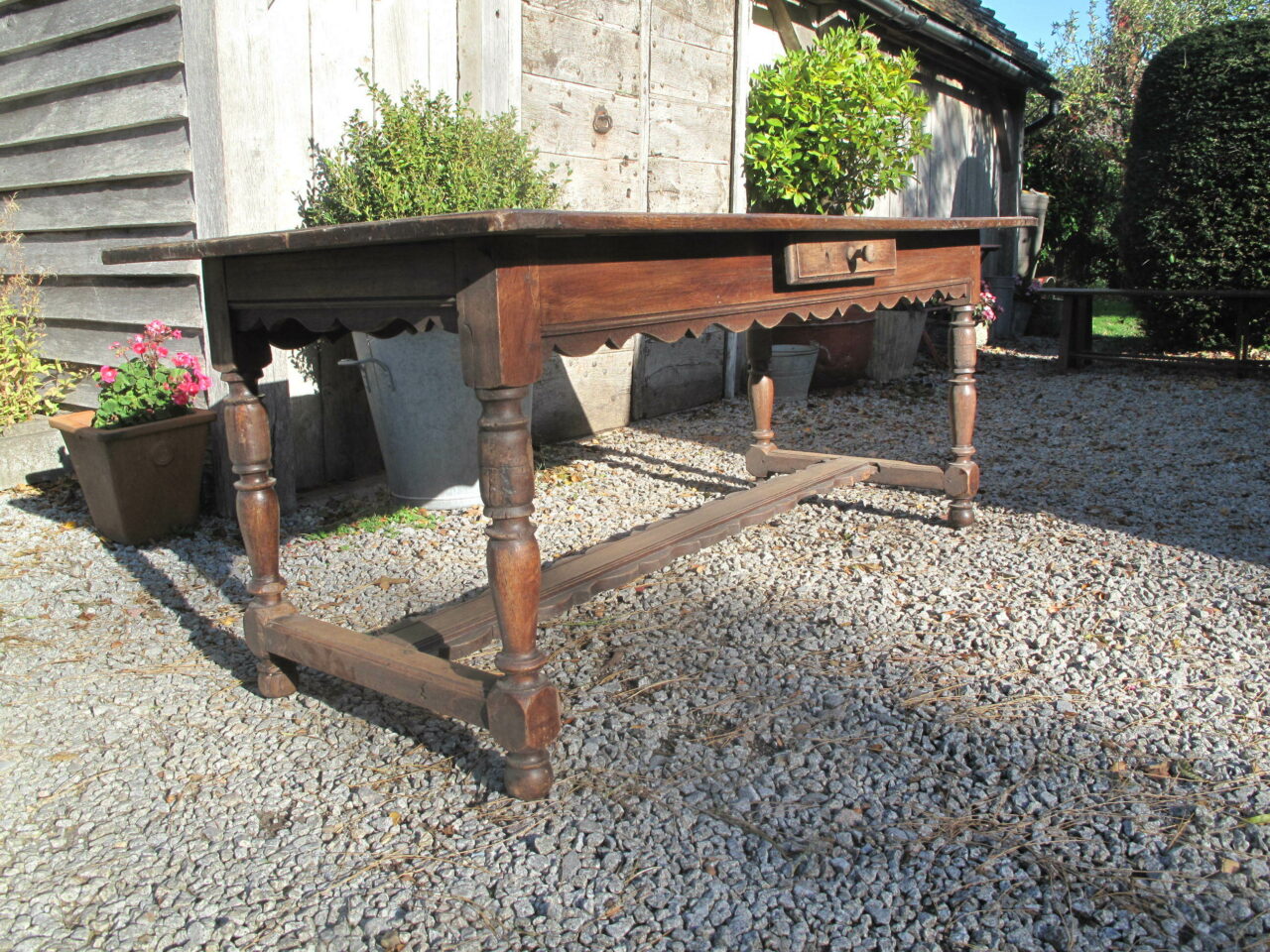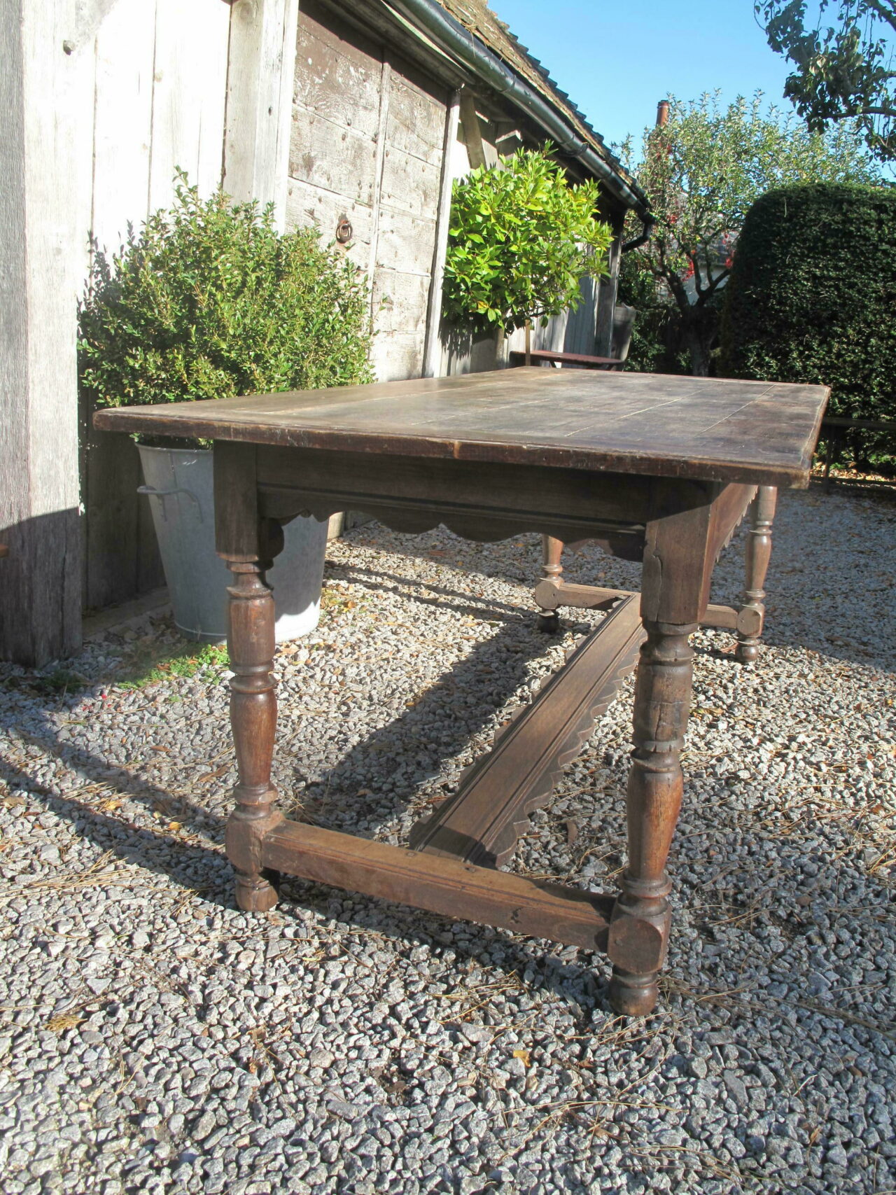Large antique oak dining table from north eastern France. The table has a central sliding drawer that moves easily. The table dates from the first part of the 19th century so it has the odd knock and bruise but it is in good sturdy condition.
