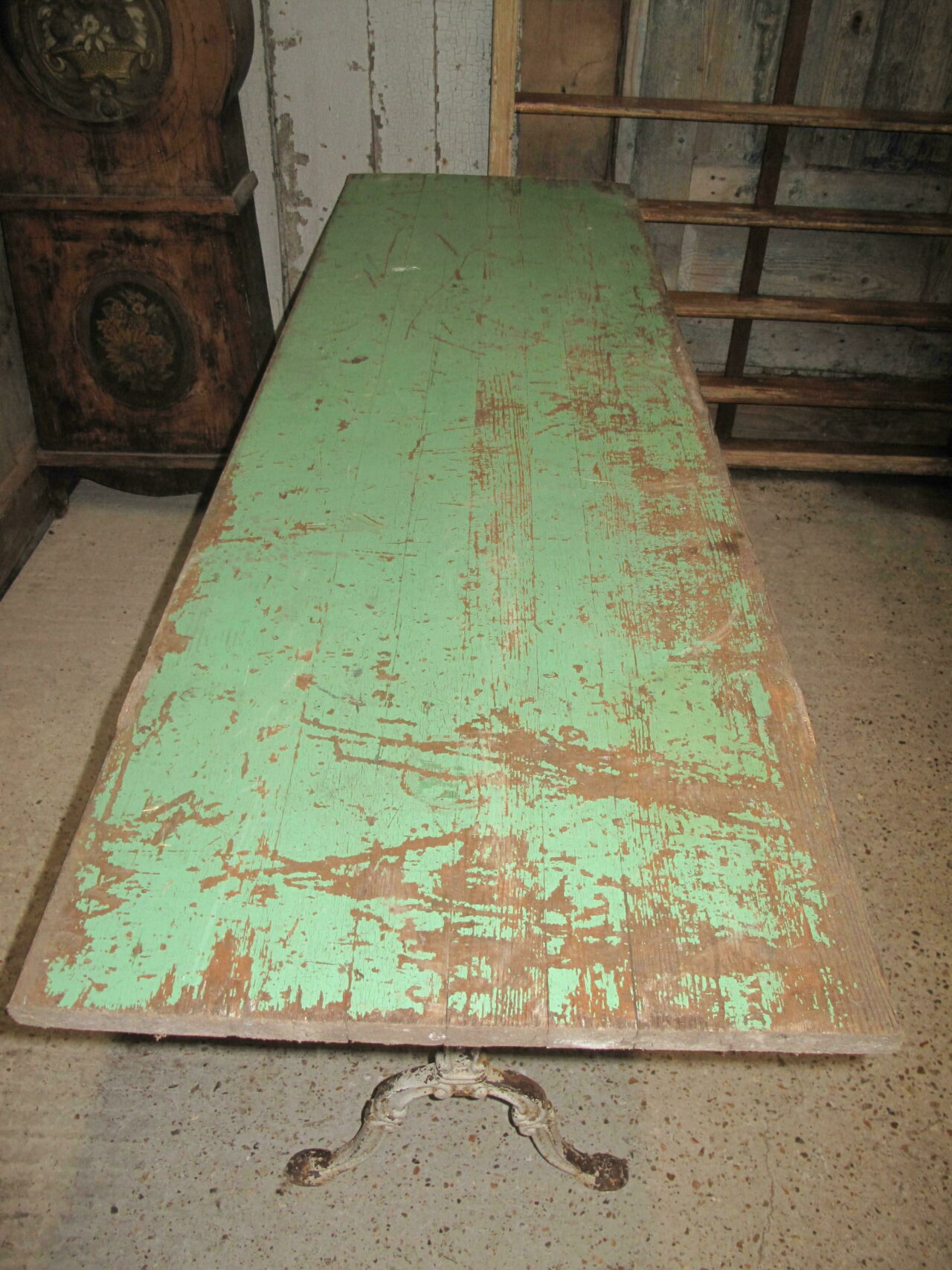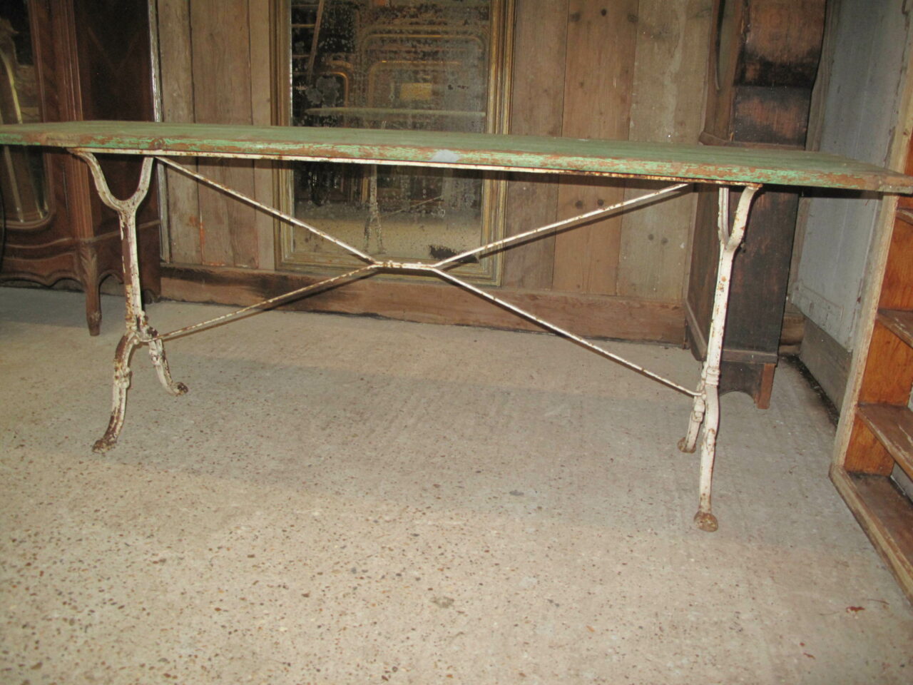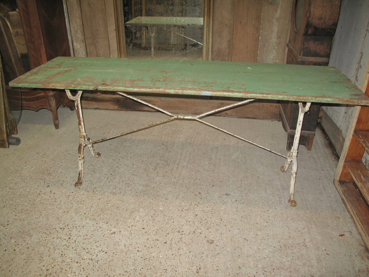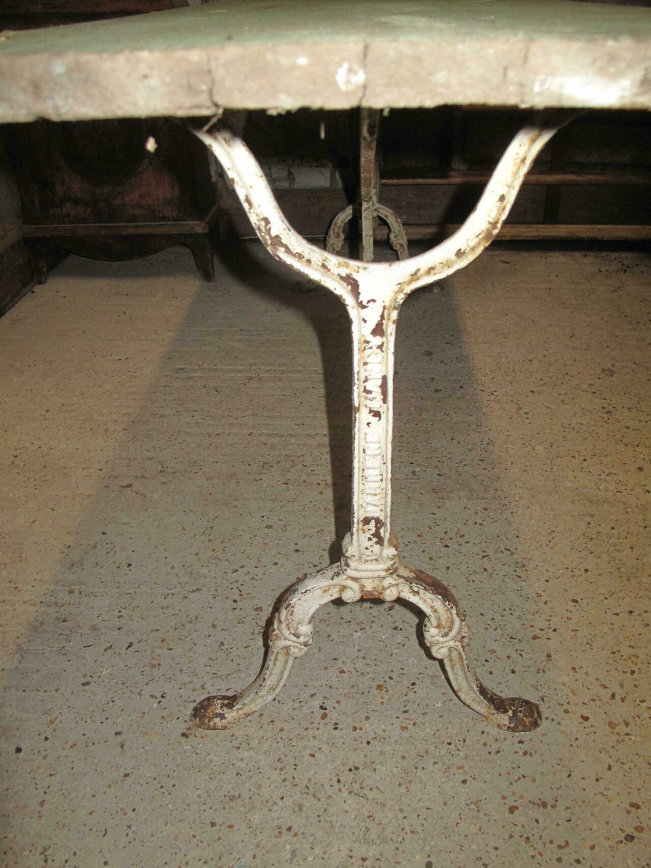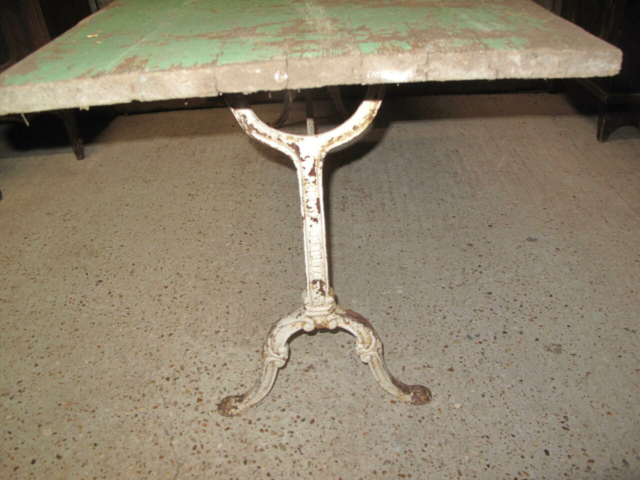 Large cast iron bistro table from Nancy in eastern France. The table is stamped Barhere Nancy on the leg. The table is in its original worn white paint. The tables pine top is also in its original green paint. c.1880.