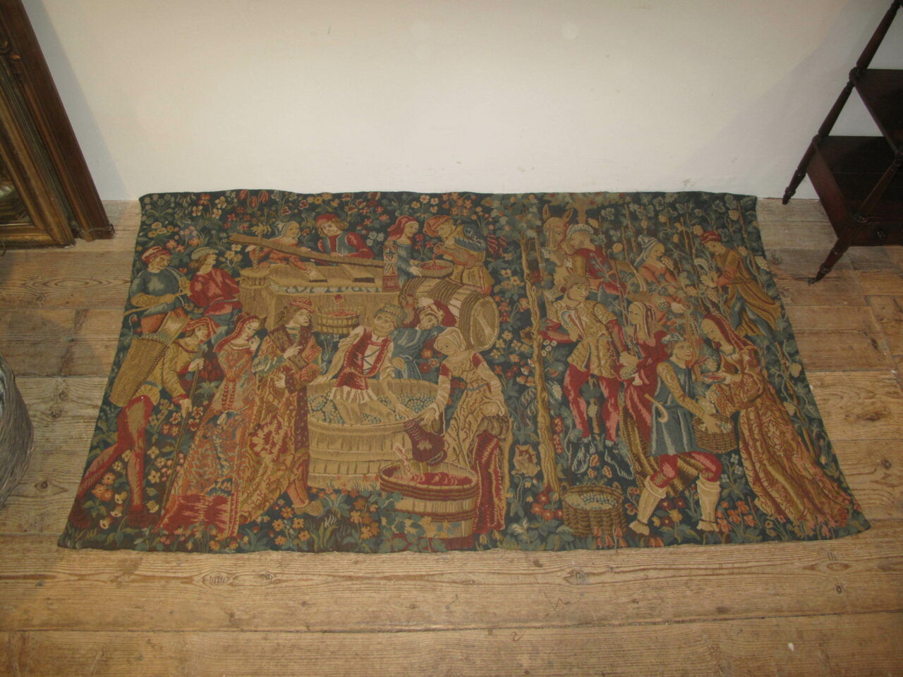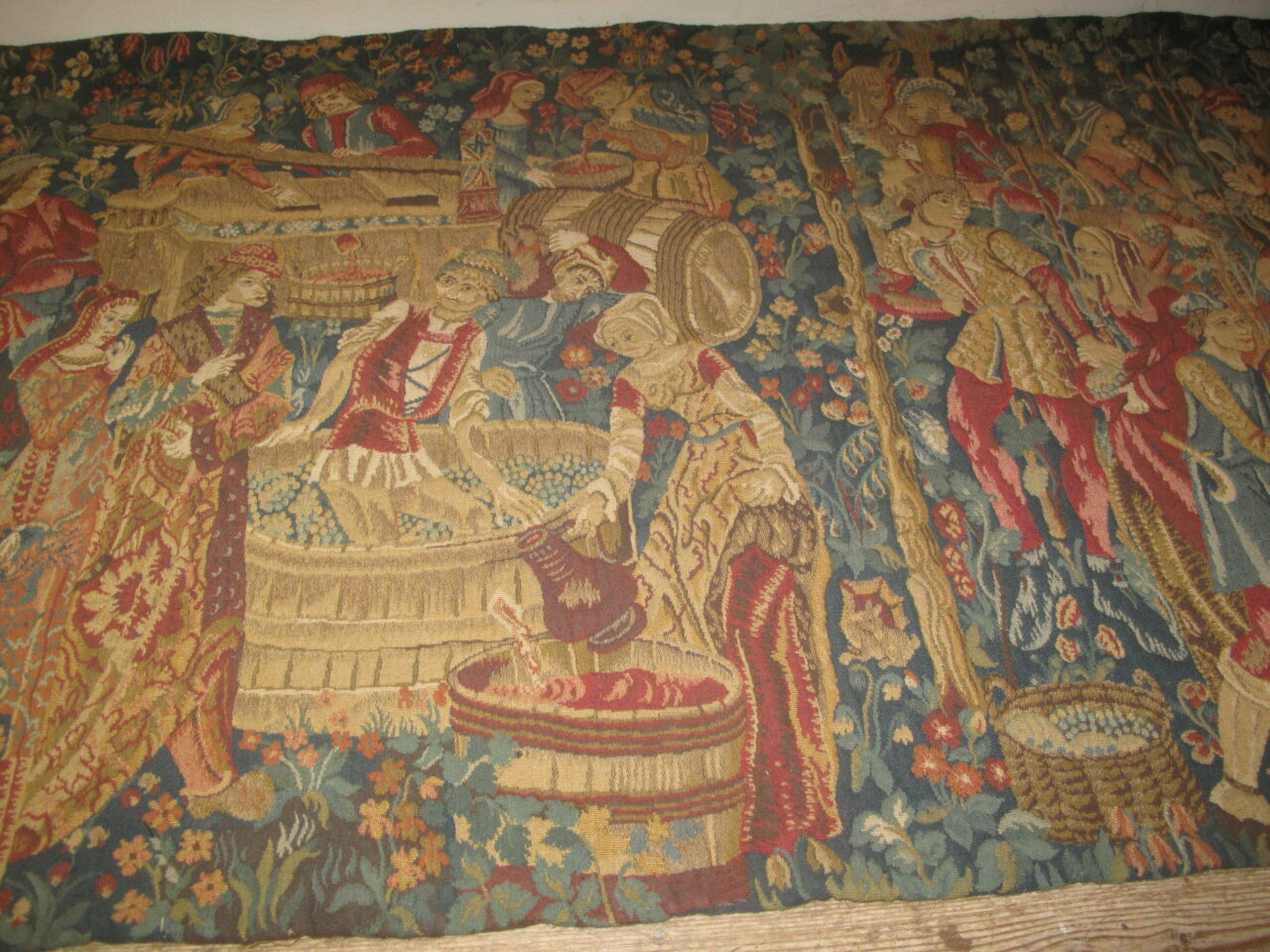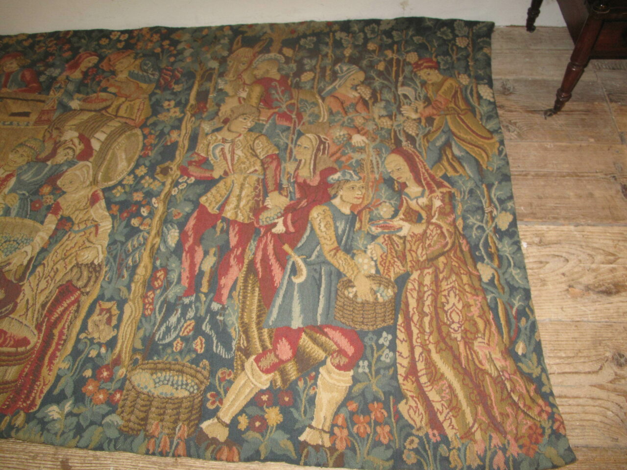 Good quality vineyard tapestry/wall hanging depicting grape picking and pressing by medieval villages. This top quality tapestry is in excellent condition. Early 20th century.