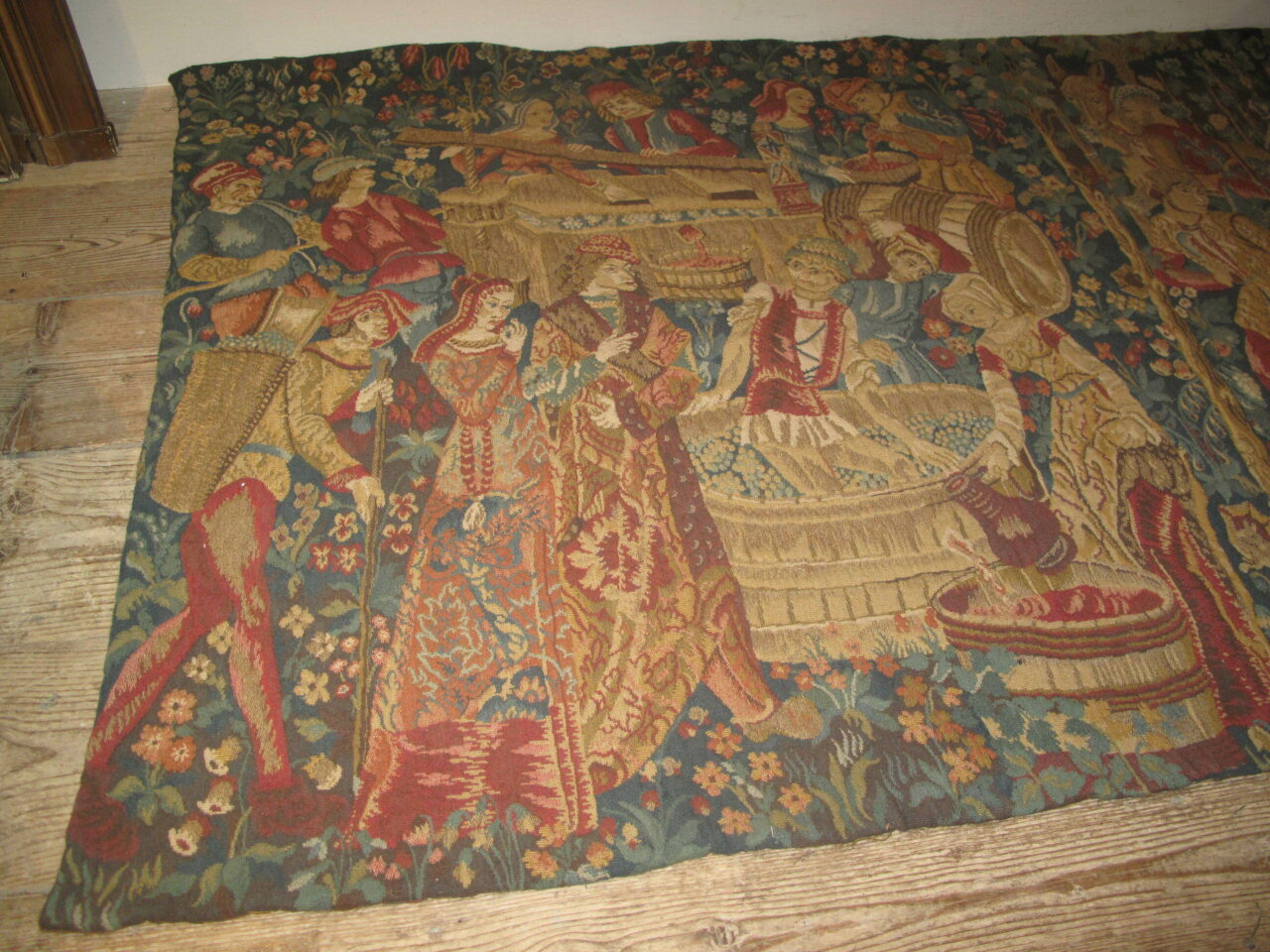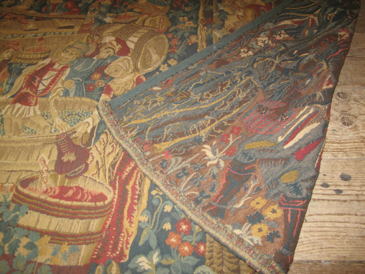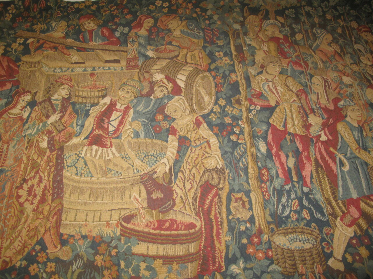 Good quality vineyard tapestry/wall hanging depicting grape picking and pressing by medieval villages. This top quality tapestry is in excellent condition. Early 20th century.