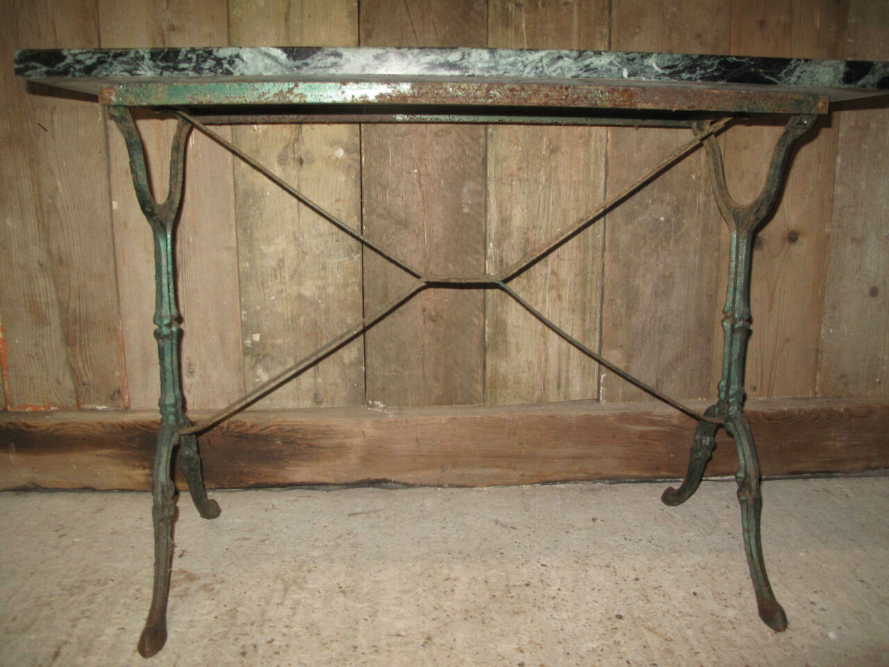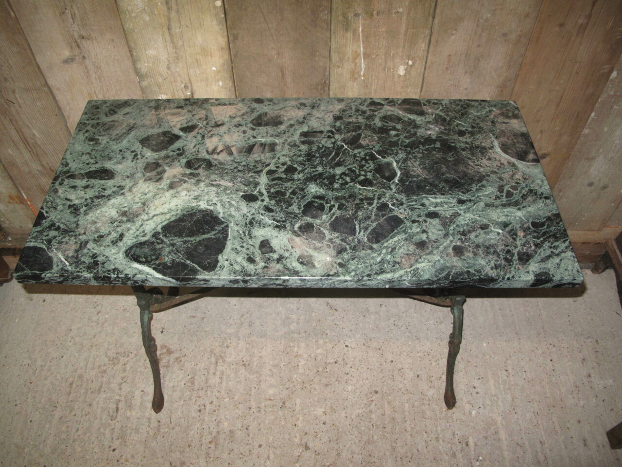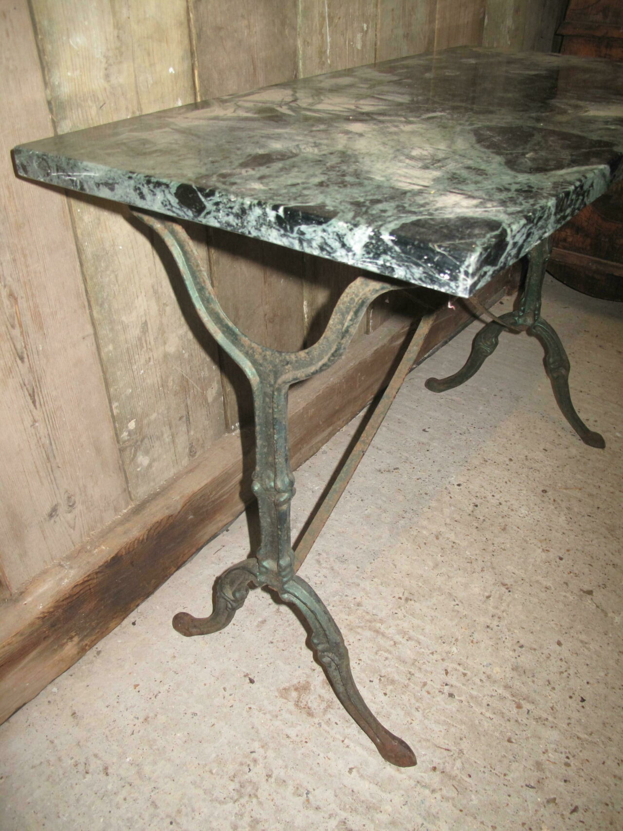 Marble top bistro table with its original green veined marble top. Both the cast iron base and the marble are in good undamaged condition. The table can be used inside or outside. Early 20th century.