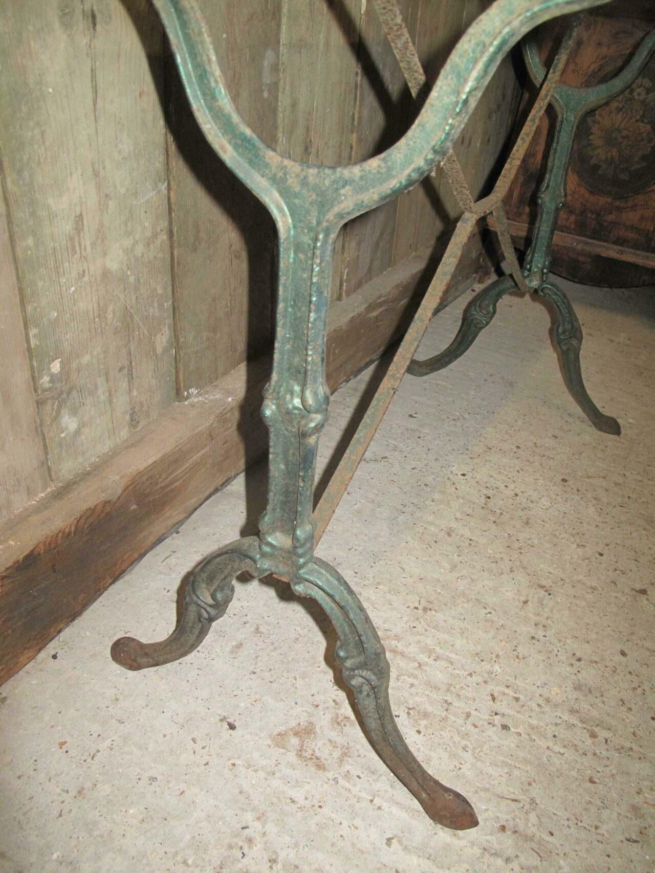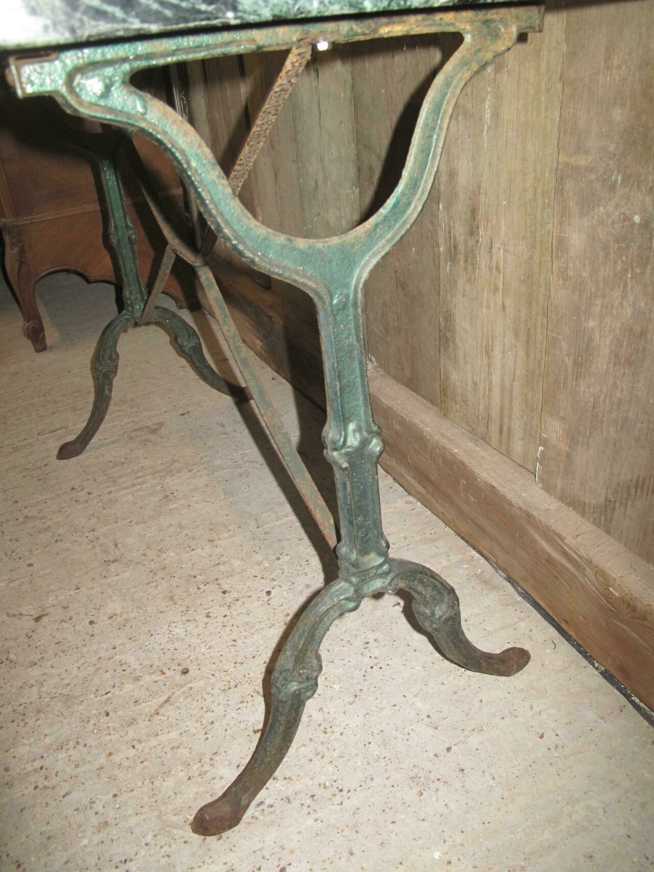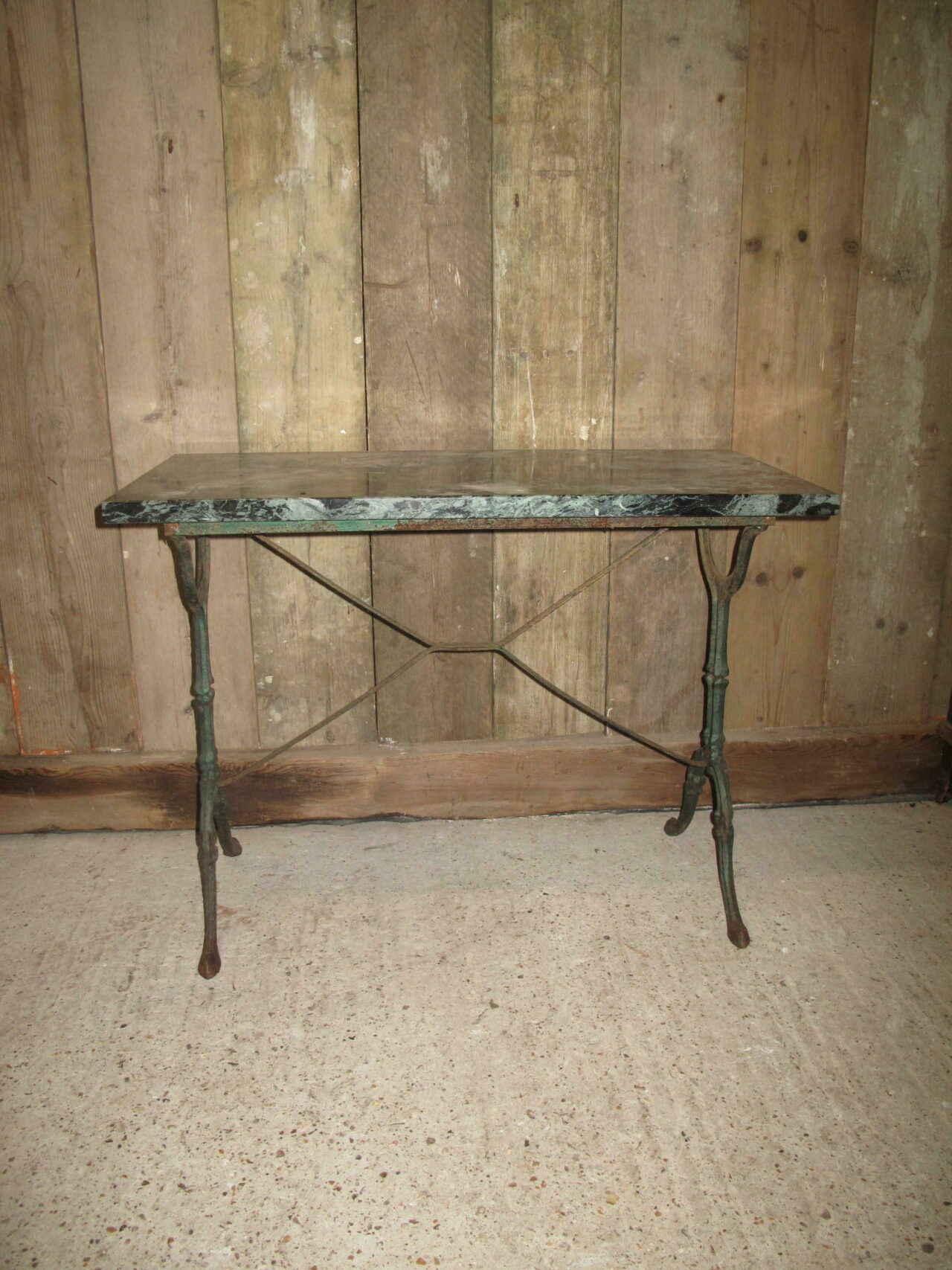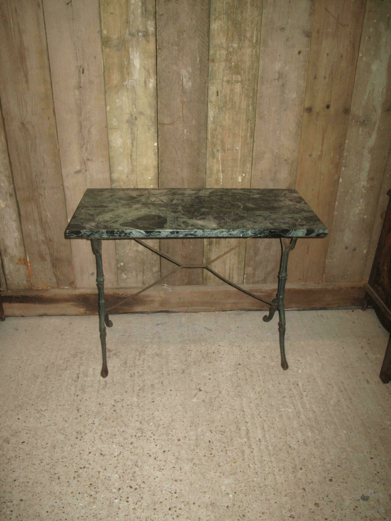 Marble top bistro table with its original green veined marble top. Both the cast iron base and the marble are in good undamaged condition. The table can be used inside or outside. Early 20th century.