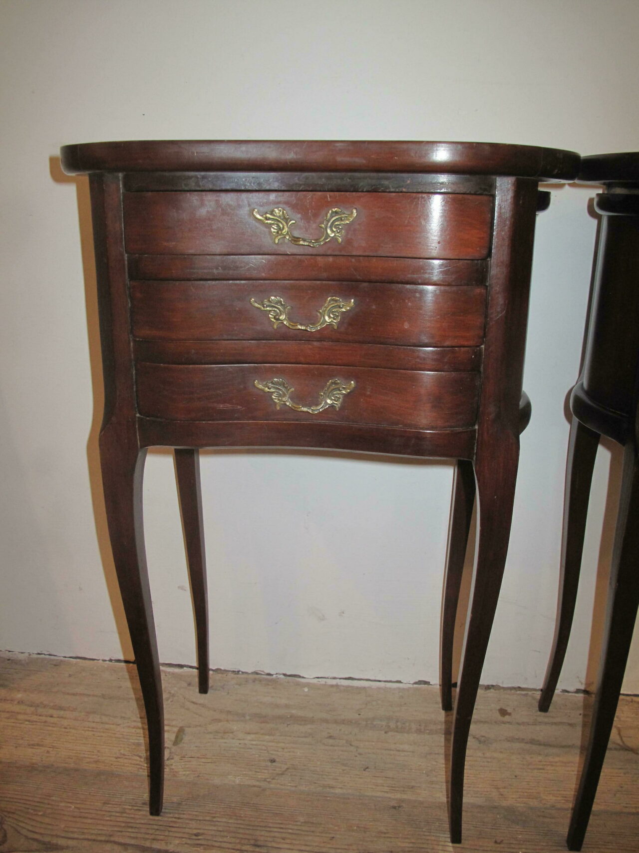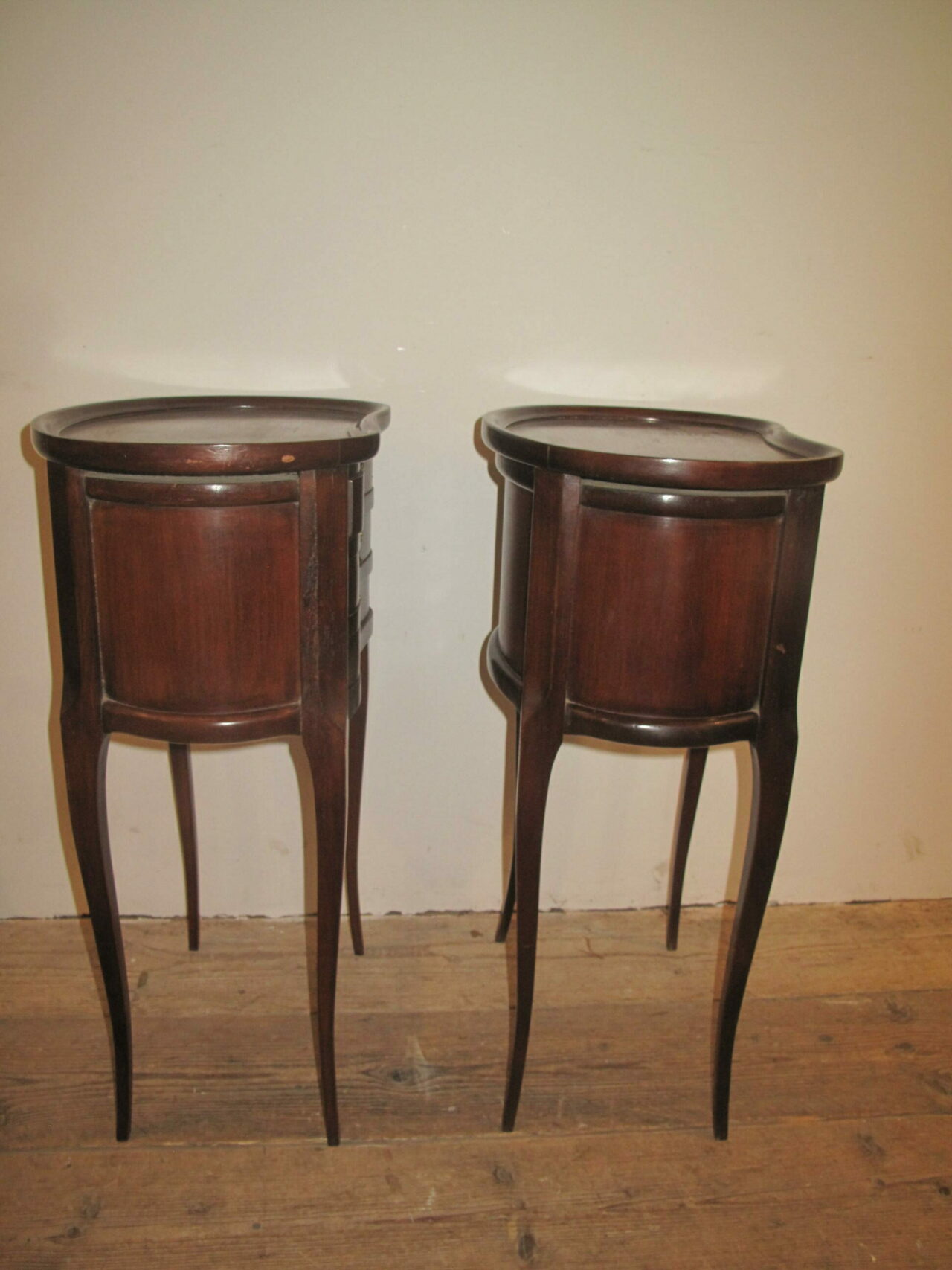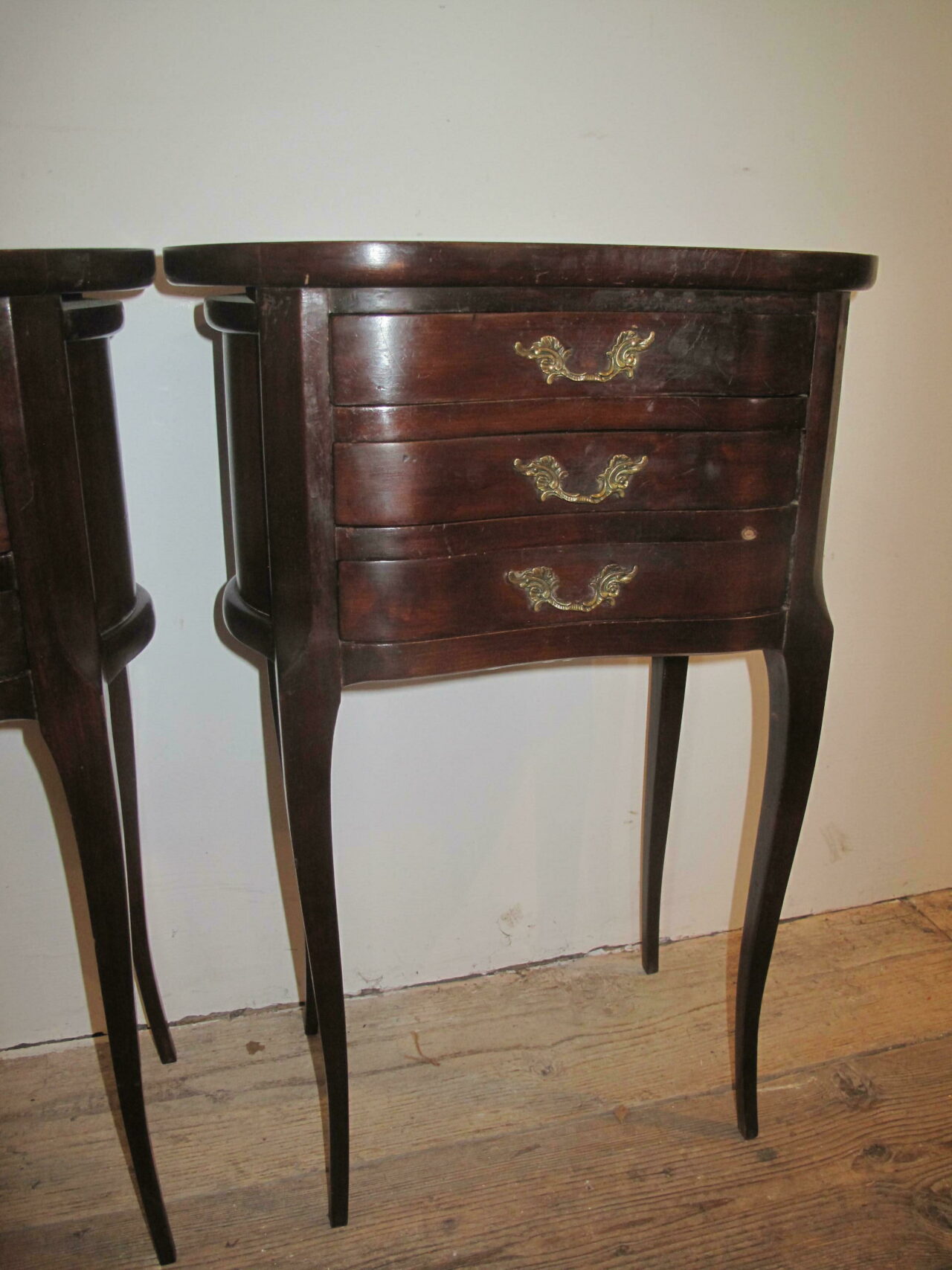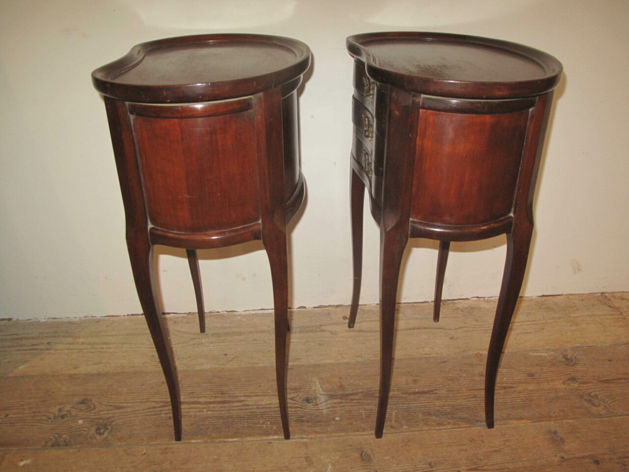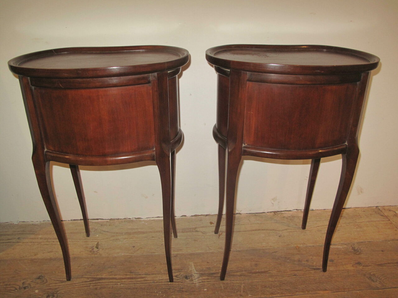 Pair of early 20th century kidney shaped bedside cabinets with brass handles. The cabinets are in good order and of the drawers slide easily. (Price is for the pair)
