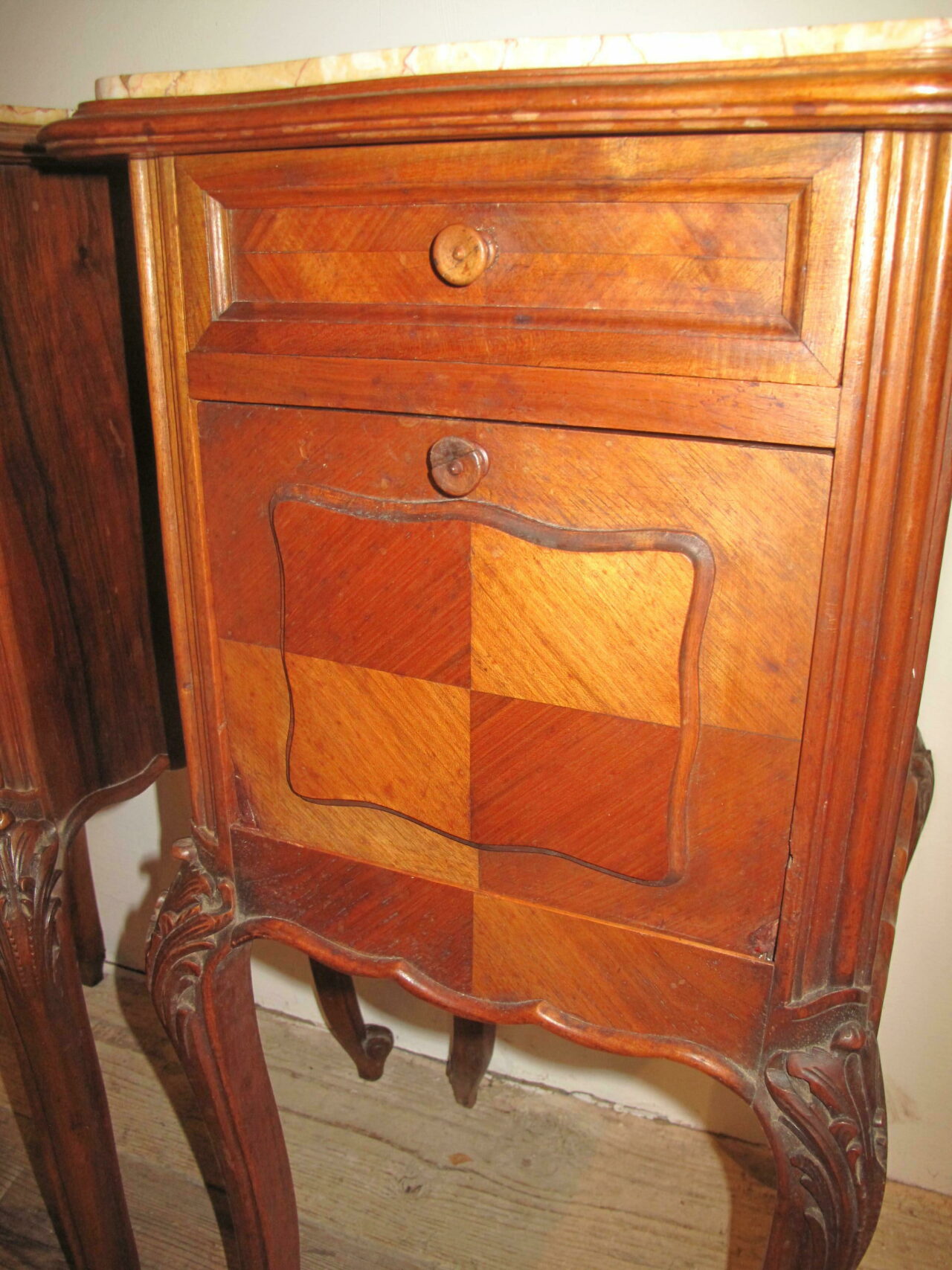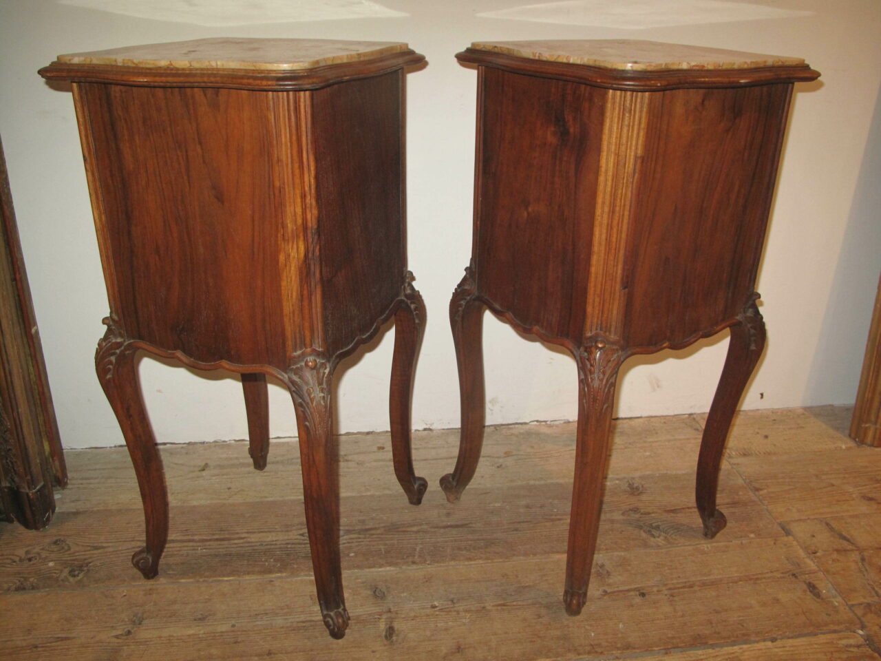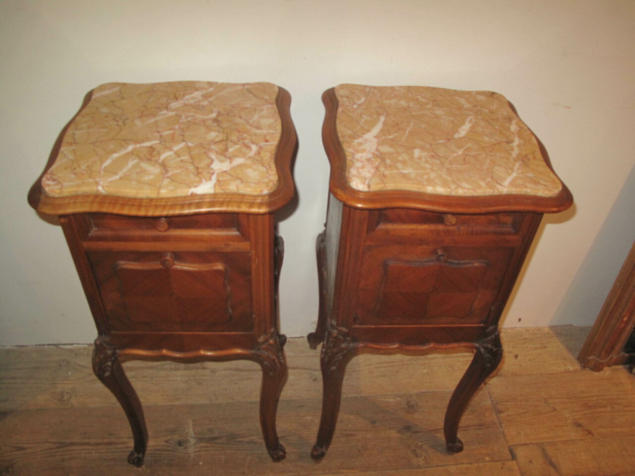Pair of bedside cabinets with pottery inserts. The cabinets are sturdy with unbroken marble tops. Small old repair to one door see close up photo. c,1900.