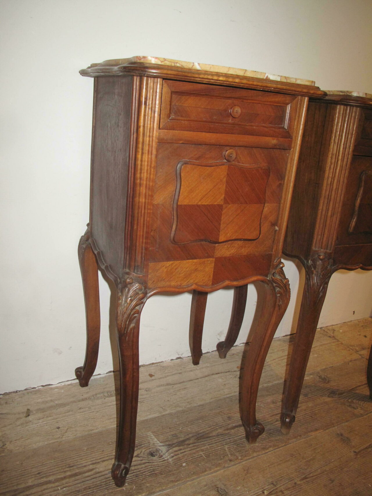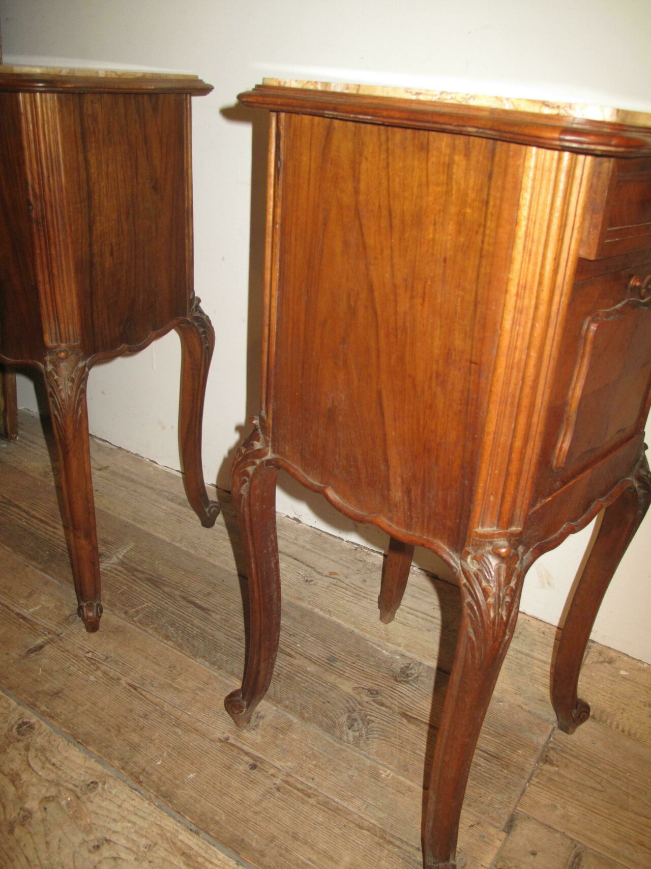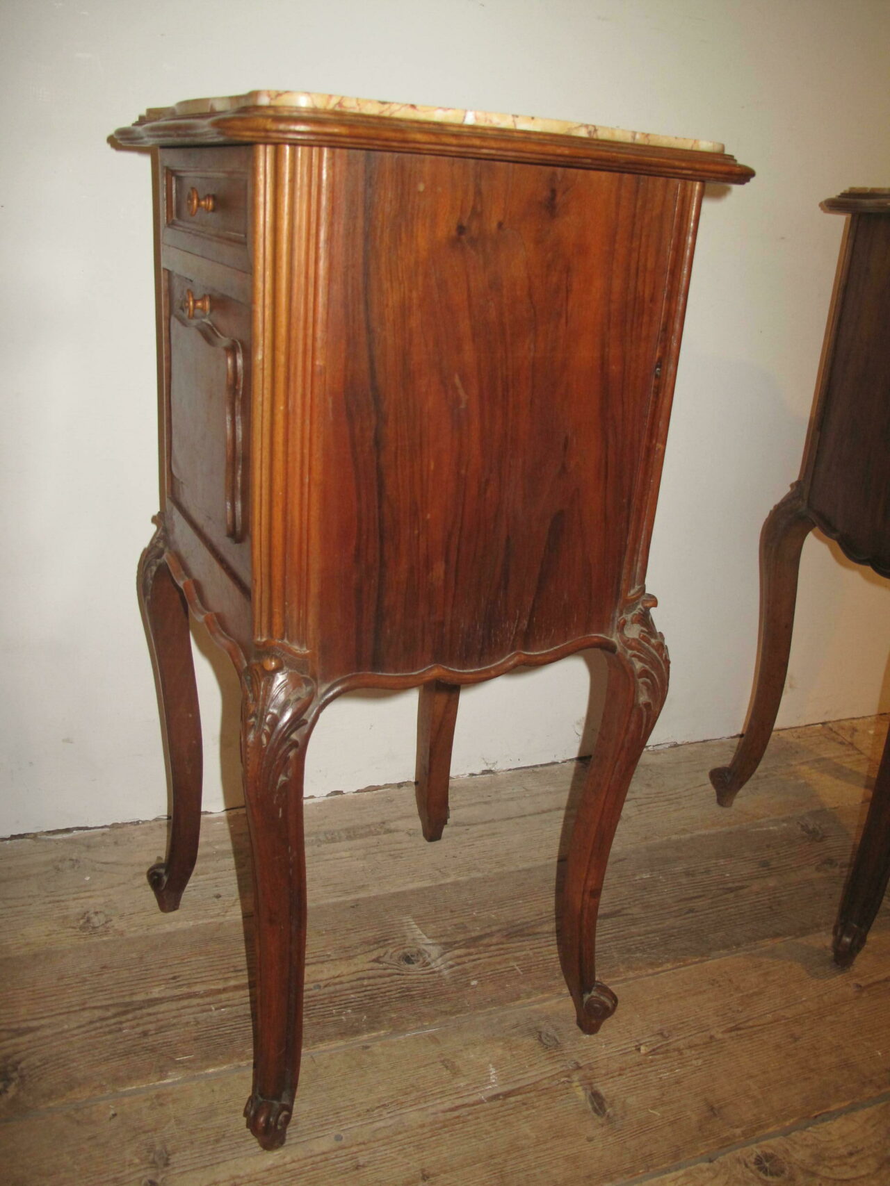 Pair of bedside cabinets with pottery inserts. The cabinets are sturdy with unbroken marble tops. Small old repair to one door see close up photo. c,1900.